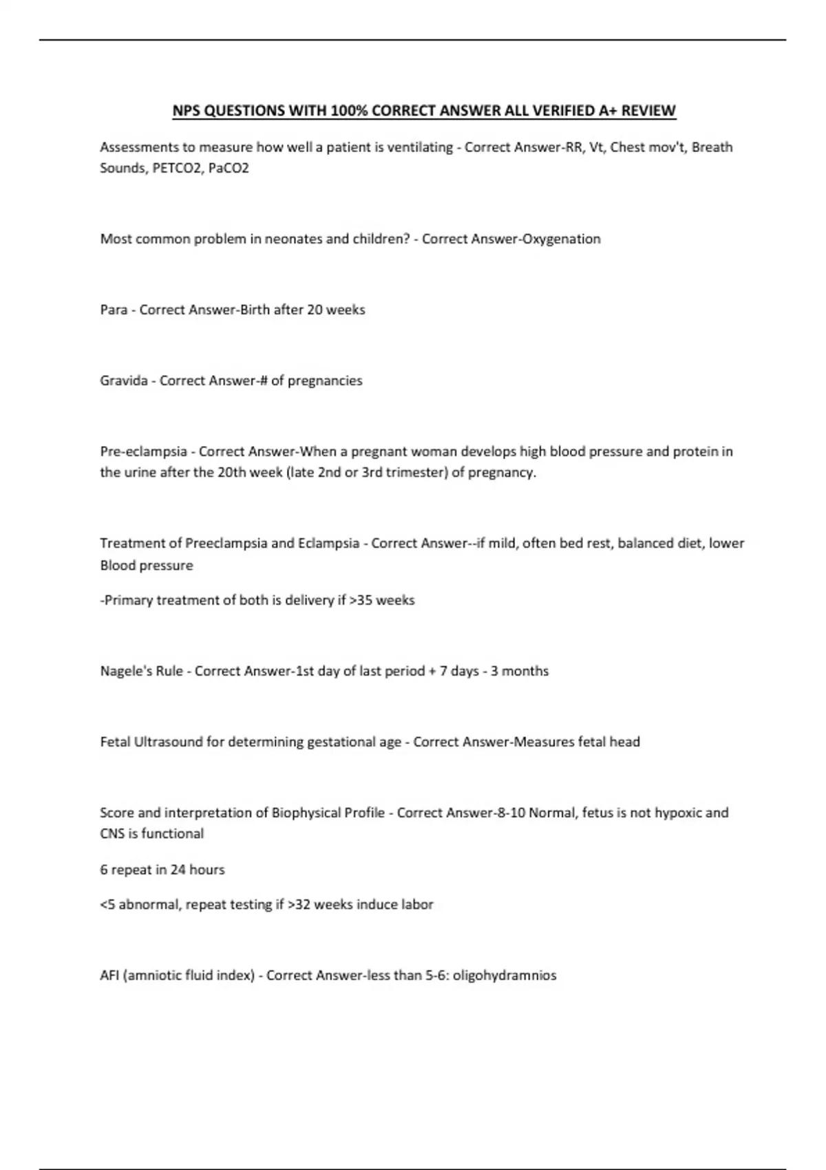 NPS QUESTIONS WITH 100% CORRECT ANSWER ALL VERIFIED A+ REVIEW Assessments to measure how well a patient is ventilating - Correct Answer-RR, Vt, Chest mov't, Breath Sounds, PETCO2, PaCO2 Most common problem in neonates and children? - Correct Answer-Oxygenation Para - Correct Answer-Birth after 20 weeks Gravida - Correct Answer-# of pregnancies Pre-eclampsia - Correct Answer-When a pregnant woman develops high blood pressure and protein in the urine after the 20th week (late 2nd or 3rd trimester) of pregnancy. Treatment of Preeclampsia and Eclampsia - Correct Answer--if mild, often bed rest, balanced diet, lower Blood pressure -Primary treatment of both is delivery if >35 weeks Nagele's Rule - Correct Answer-1st day of last period + 7 days - 3 months Fetal Ultrasound for determining gestational age - Correct Answer-Measures fetal head Score and interpretation of Biophysical Profile - Correct Answer-8-10 Normal, fetus is not hypoxic and CNS is functional 6 repeat in 24 hours <5 abnormal, repeat testing if >32 weeks induce labor AFI (amniotic fluid index) - Correct Answer-less than 5-6: oligohydramnios 8-18 normal >20-24 Polyhydramnios Olihydramnios - Correct Answer-associated with Potters Syndrome polyhydramnios - Correct Answer-excessive amniotic fluid associated with TE fistula, esophageal atresia Ways to measure lung maturity - Correct Answer-L/S Ratio PG (Phosphatidylglycerol) S/A (Surfactant/Albumin) LBC (Lamellar Body Count) Shake Test How to measure L/S Ratio and normal - Correct Answer-via amniocenteses 2:1 or higher indicates pulmonary maturity and low risk of RDS Phosphatidyglycerol (PG) - Correct Answer-best diagnosis of lung maturity when diabetes is suspected surfactant/albumin ratio - Correct Answer-55 or greater is good. Less expensive than LS and cheaper LBC (Lamellar bodies count) - Correct Answer-lung maturity is reached when LBC reaches 35,000 Shake Test - Correct Answer-Mix amniotic fluid with 95% ethanol, results in 15 minutes, presence of bubbles indicates the presence of surfactant. Not as specific as the L/S Ratio