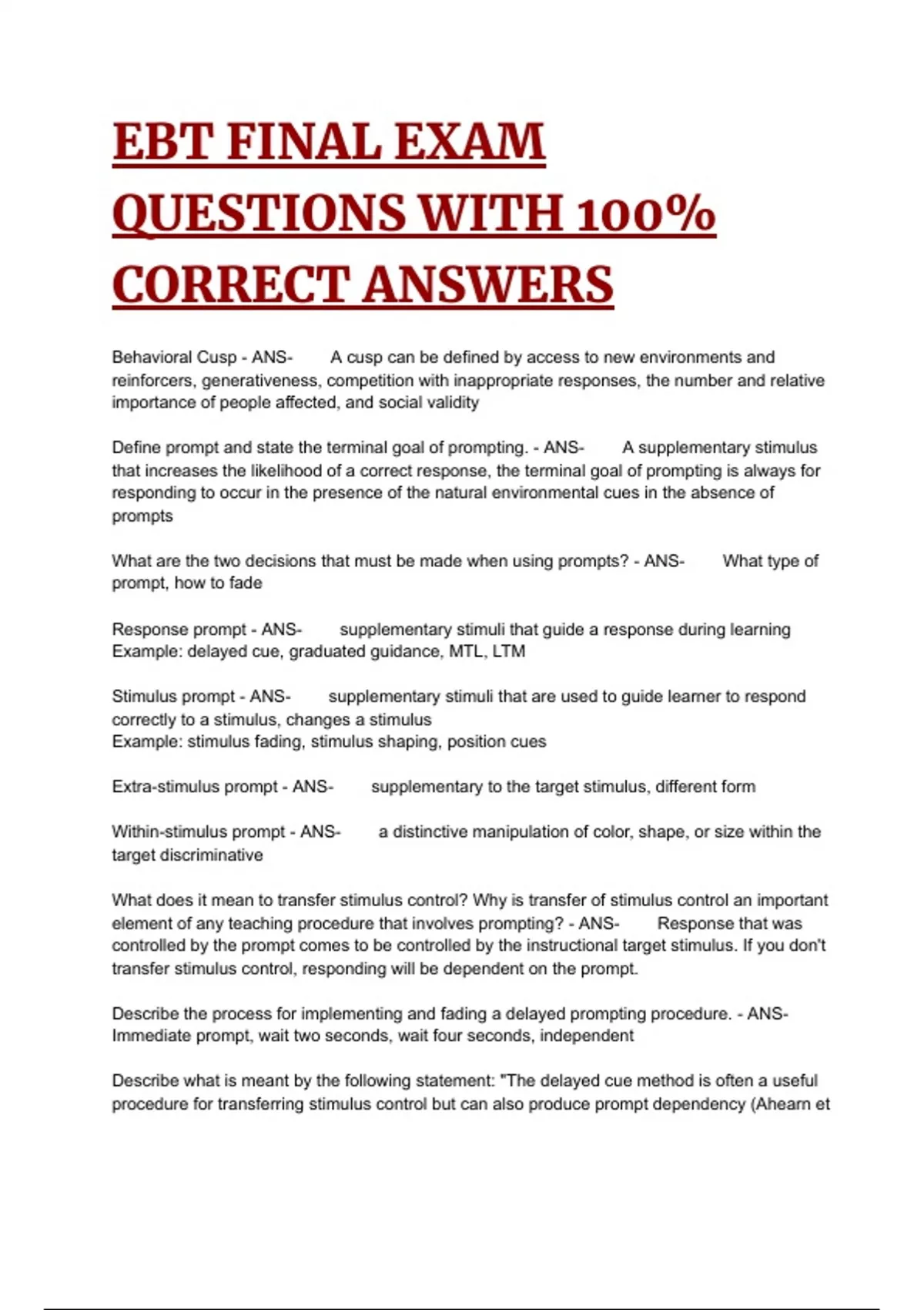 Behavioral Cusp - ANS- A cusp can be defined by access to new environments and reinforcers, generativeness, competition with inappropriate responses, the number and relative importance of people affected, and social validity Define prompt and state the terminal goal of prompting. - ANS- A supplementary stimulus that increases the likelihood of a correct response, the terminal goal of prompting is always for responding to occur in the presence of the natural environmental cues in the absence of prompts What are the two decisions that must be made when using prompts? - ANS- What type of prompt, how to fade Response prompt - ANS- supplementary stimuli that guide a response during learning Example: delayed cue, graduated guidance, MTL, LTM Stimulus prompt - ANS- supplementary stimuli that are used to guide learner to respond correctly to a stimulus, changes a stimulus Example: stimulus fading, stimulus shaping, position cues Extra-stimulus prompt - ANS- supplementary to the target stimulus, different form Within-stimulus prompt - ANS- a distinctive manipulation of color, shape, or size within the target discriminative What does it mean to transfer stimulus control? Why is transfer of stimulus control an important element of any teaching procedure that involves prompting? - ANS- Response that was controlled by the prompt comes to be controlled by the instructional target stimulus. If you don't transfer stimulus control, responding will be dependent on the prompt. Describe the process for implementing and fading a delayed prompting procedure. - ANS- Immediate prompt, wait two seconds, wait four seconds, independent Describe what is meant by the following statement: "The delayed cue method is often a useful procedure for transferring stimulus control but can also produce prompt dependency (Ahearn et al., 2007, p. 62)." - ANS- Fading prompts on a time delay is useful because it allows time for the learner to independently initiate the response in the absence of a prompt, however, some learners will wait for the prompt in order to make a correct response that results in some type of reinforcement. What is graduated guidance and why is it difficult to implement properly? - ANS- Systematic fading out for prompts - typically starts with full manual guidance, uses only as much assistance as needed to produce correct response Requires skill on part of teacher Must be practiced and reinforced in order to be in teacher's repertoire Requires consistency Difficult to implement across multiple teachers Distinguish between graduated guidance and most-to-least fading of prompts. - ANS- Graduated guidance - Use only as much prompting as necessary, fading occurs within the session Most to least - Criterion to fade is determined by performance across trials and sessions and fading is done in prescribed hierarchy. Faster learners may learn faster with graduated guidance, as MTL sets a limit on how fast prompts will be faded. Is least-to-most fading of prompts an errorless procedure? Support your answer. Also, in what situation is this procedure more appropriate? - ANS- Least-to-most prompting is not an errorless procedure, because it allows the learner to make errors before the prompt is delivered. Least-to-most prompting is most appropriately used in situations in which the learner has the skills to complete the task and is unlikely to make errors. What does it mean to "fade in S-"? How was this done in the Schreibman study? - ANS- Responding to the S+ stimulus was taught, the S- stimuli were gradually increased until they were of equal intensity as the S+ What is stimulus shaping? Give an example. - ANS- Gradually changing the S+ and S- over trials, gradually change known letters into unknown letters over successive trials by changing their shape Etzel & LeBlanc (1979) note a few considerations for choosing between stimulus shaping and stimulus fading. List and briefly describe these. - ANS- Motivation, incompatible responses to learning, prerequisite skills, effective teacher instruction—detailed, relative to desired response, rate and timing of instruction Describe how the S- was introduced to different groups (independent variables) in the first series of S+ S- sessions in Exp. 1. (Terrace, 1965) - ANS- Early-progressive—introduced 30 s after key peck had been conditioned. S- was a dark key, and was only presented for 5 seconds, then time was gradually increased until the key was presented for 30 seconds. Then, the S- was made to be equally bright as the S+, but was only presented for 5 seconds and then time was gradually increased until the key was presented for 30 seconds. In the final phase, the S- was initially presented at its full intensity for 5 seconds, and then was faded up to the terminal goal of 3 minutes. Early-constant—introduced early, key was at full brightness for full amount of time Late-progressive—same as early-progressive, but introduced later Late constant—introduced later, key was at full brightness for full amount of time In general, what were the differences in how the S- was introduced in the progressive sessions in Exp II? (p. 7 and Table 3) (Terrace, 1965) - ANS- S- was introduced in two phases—first key was illuminated for .5 second and was initially presented at 0% brightness and then increased to full brightness, then key was illuminated at full brightness, and was faded from .5 seconds to 5 seconds. What does Terrace cite as the main finding in these experiments? - ANS- The main finding of the experiment was that an operant discrimination can be learned with few errors (responses to the S-) and that the number of errors that occur are a function of the way in which the S- is introduced (progressive vs. constant). Describe with examples the difference between simultaneous and successive discriminations as used by Saunders and Spradlin. - ANS- Simultaneous—discrimination between comparisons Successive—discrimination between samples What two aspects of their proce