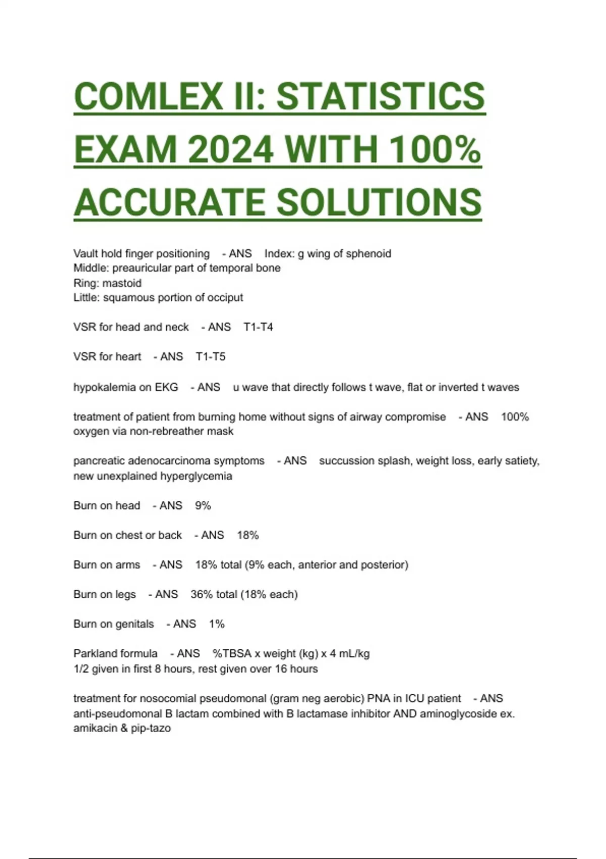 Vault hold finger positioning - ANS Index: g wing of sphenoid Middle: preauricular part of temporal bone Ring: mastoid Little: squamous portion of occiput VSR for head and neck - ANS T1-T4 VSR for heart - ANS T1-T5 hypokalemia on EKG - ANS u wave that directly follows t wave, flat or inverted t waves treatment of patient from burning home without signs of airway compromise - ANS 100% oxygen via non-rebreather mask pancreatic adenocarcinoma symptoms - ANS succussion splash, weight loss, early satiety, new unexplained hyperglycemia Burn on head - ANS 9% Burn on chest or back - ANS 18% Burn on arms - ANS 18% total (9% each, anterior and posterior) Burn on legs - ANS 36% total (18% each) Burn on genitals - ANS 1% Parkland formula - ANS %TBSA x weight (kg) x 4 mL/kg 1/2 given in first 8 hours, rest given over 16 hours treatment for nosocomial pseudomonal (gram neg aerobic) PNA in ICU patient - ANS anti-pseudomonal B lactam combined with B lactamase inhibitor AND aminoglycoside ex. amikacin & pip-tazo cryoprecipitate - ANS factors VIII & XIII, fibrinogen, and vWF -use when indication for FFP present, but pt is volume overloaded or if fibrinogen deficient Whipple procedure - ANS head of pancreas, duodenum, GB, CBD; prox jejunum, distal stomach prenatal visit frequency - ANS every 4 weeks from weeks 0-28 every 2-3 weeks from weeks 28-36 every week until delivery CML - ANS sx: splenomegaly (epigastric pain & satiety) labs: leukocytosis, myeloblasts, basophilia, granulocytosis, neutrophils, bands, & segmented mature cells CLL - ANS most common after 50 y/o dx: lymphocytosis w/ predom mature small lymphocytes myelodysplastic syndrome - ANS dysplastic neutrophils, pancytopenia, hypercellular bone marrow Nocardia - ANS gram positive branching bacilli cause of hydrocele - ANS patent processus vaginalis sarcoidosis treatment - ANS corticosteroids ankylosing spondylitis imaging results - ANS squaring of L-spine vertebral bodies, complete fusion of vertebral column, diffuse sclerosis, syndesmophytes tx w/ NSAIDs & PT MEN 1 - ANS pituitary adenoma (vision changes), parathyroid hyperplasia (hyperCa), pancreatic islet cell tumor (gastrinoma) teratoma - ANS nonseminomatous germ cell tumor, heterogenous w/ calcifications and cystic areas, hyperechoic negative AFP, B-hCG, & estradiol yolk sac tumor (endodermal sinus) - ANS most common testicular malig in prepubertal males, painless testicular mass -incr AFP w/ negative B-hCG & estradiol anal fissure - ANS tear b/c recurrence passage of hard stools; severe pain w/ defecation tx w/ topical nitroglycerin hemorrhoid treatment - ANS fiber, fluids, & laxatives; NOT topical NTG hypospadias management - ANS NO CIRCUMCISION refer to urology (surgery at 6 mo-1 year of age) lab finding in upper GI bleed - ANS elevated aldosterone, BUN, BUN:creatinine ratio GGT elevation - ANS hepatobiliary disease only (hepatomegaly, jaundice) Granulomatosis with polyangiitis (Wegener) - ANS antiproteinase-3 (PR3-ANCA) and c-ANCA tx w/ steroids & cyclophosphamide Post-streptococcal glomerulonephritis - ANS 2 weeks after GABHS -oliguria, edema, HTN, smoky brown urine dx: decr C3, pos ASO, lumpy bumpy subepithelial IgG & C3 deposits Henoch-Schonlein Purpura - ANS decr C4, incr IgA, active urinary sediment vasospastic ulcer due to Raynaud - ANS dry, painful, no pulse, mottled toes exacerbated by B-blocker optic nerve injury - ANS unilat vision loss and relative afferent pupillary defect/Marcus Gunn pupil; dx w/ CT Orbit light in uninjured eye: b/l equal constriction light in injured eye: b/l dilation retinal artery occlusion - ANS Cherry spot on macula due to atherosclerotic emboli from I/L carotid artery order neck duplex U/S optic neuritis - ANS sudden vision loss & pain w/ EOMI -seen in MS dx w/ visual evoked potential testing treatment of asymptomatic newborn w/ unvaccinated symptomatic varicella mother - ANS give varicella-zoster immunoglobulin IF maternal infection within 5 days before to 2 days after delivery Management of NPH - ANS VP shunt communicating hydrocephalus w/ normal opening P H. pylori treatment - ANS Triple: clarithromycin, amox, & PPI x 14 d Quad: bismuth, metro, tetra, & PPI x 14 d ACTH independent Cushing's syndrome (decr ACTH) - ANS exogenous steroids & cortisol-producing adrenal adenoma ACTH DEPendent Cushing's (incr ACTH) - ANS pituitary adenoma (Cushing dz) & ectopic/paraneoplastic ACTH production (small cell lung cancer) Diagnosis when decreased cortisol after high dose dexamethasone? - ANS pituitary adenoma Diagnosis when no change in cortisol after high dose dexamethasone? - ANS adrenal adenoma (decr ACTH), ectopic ACTH Polyarteritis nodosa - ANS fever, abd pain, focal motor deficits, erythematous subcutaneous nodules, livedo reticularis, & mesenteric artery aneurysms associated w/ Hep B (dsDNA virus), Hep C, & hairy cell leukemia Nail condition seen in psoriasis - ANS onycholysis Dermatomyositis - ANS Anti-Mi-2 w/ incr CK & aldolase -interstitial lung dz initial tx w/ steroids 2nd line= methotrexate & azathioprine Lichen sclerosus on vulva - ANS postmenopausal w/ itchy vulvar white plaques & dyspareunia; no vagina sx biopsy= irregular epidermal acanthosis necrotizing fasciitis causes - ANS C perf, staph aureus, & strep pyogenes What to do if lorazepam is given for seizure and it continues after 3 minutes - ANS repeat lorazepam (if 2 doses don't work, pick from fosphenytoin, phenytoin, valproic acid, or levetiracetam) top of the basilar syndrome - ANS impaired consciousness and vertical gaze issue (preferred upward gaze) hyperthyroidism treatment in FIRST trimester - ANS PTU (methimazole in following trimesters) lice management - ANS 1st: check household members Then: send kid to school after starting tx, wash clothes used within 48 hours with hot water how to measure true leg length - ANS ASIS to medial malleolus (apparent is umbilicus to medial malleolus) treatment of asymptomatic primary ITP that has failed steroids and IV Ig - ANS splenectomy cardiogenic s