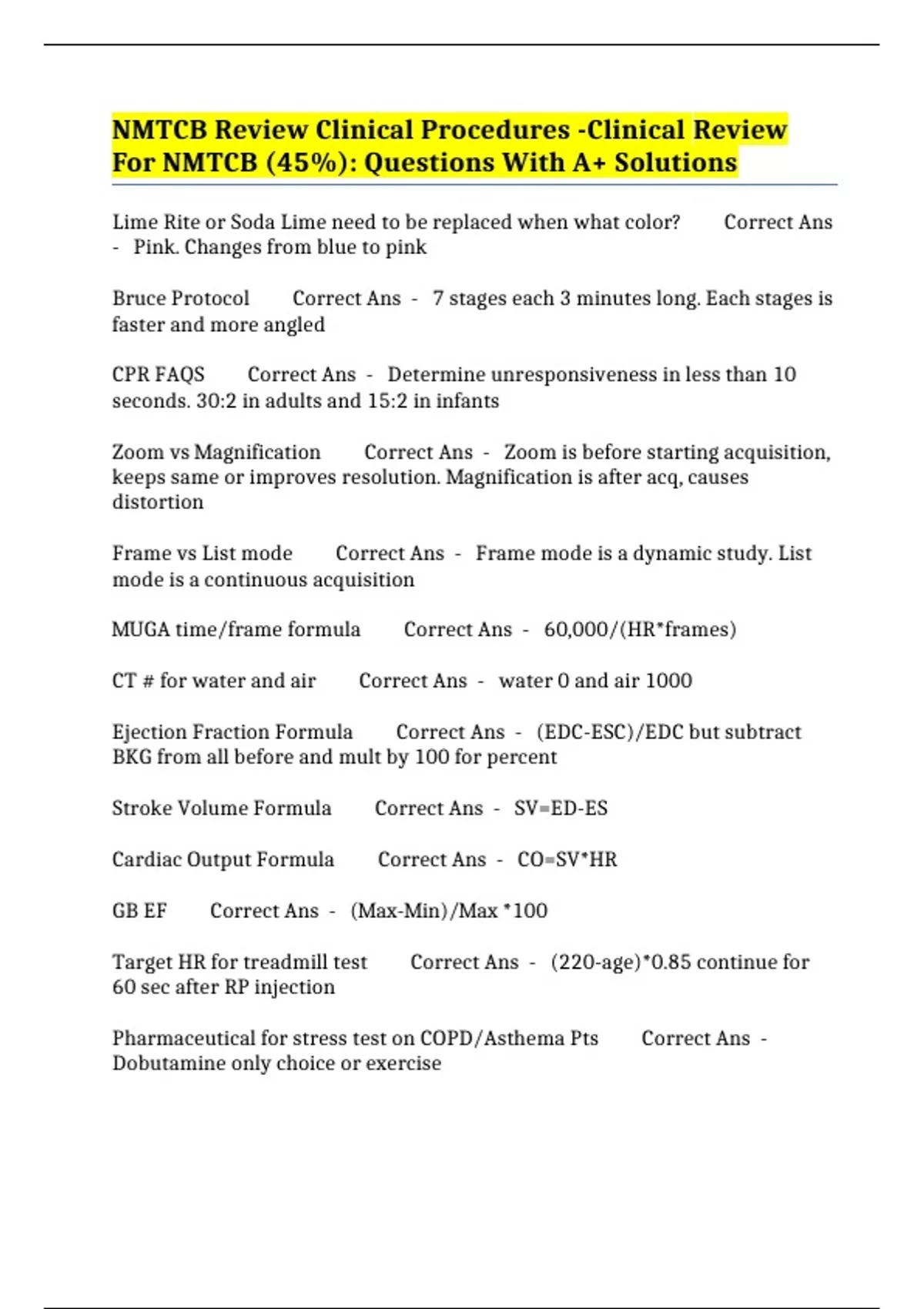 NMTCB Review Clinical Procedures -Clinical Review For NMTCB (45%): Questions With A+ Solutions