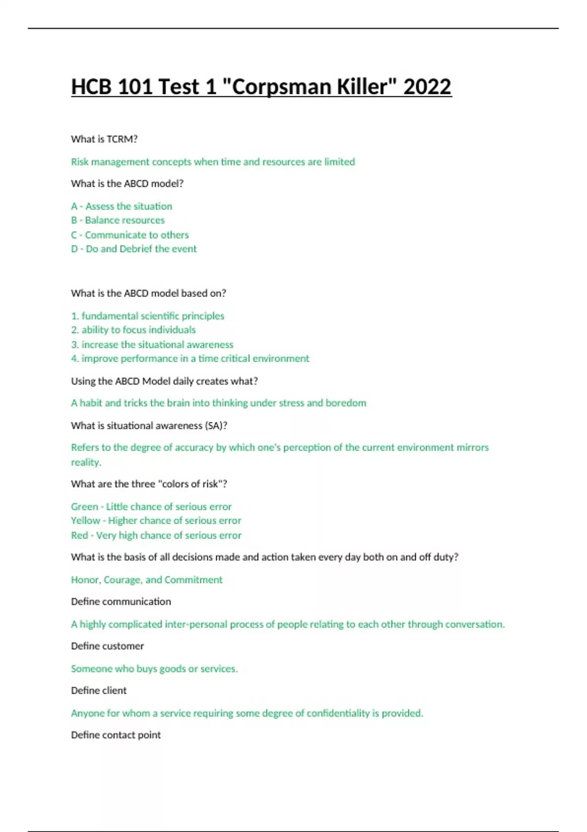 HCB 101 Test 1 Corpsman Killer 2022.