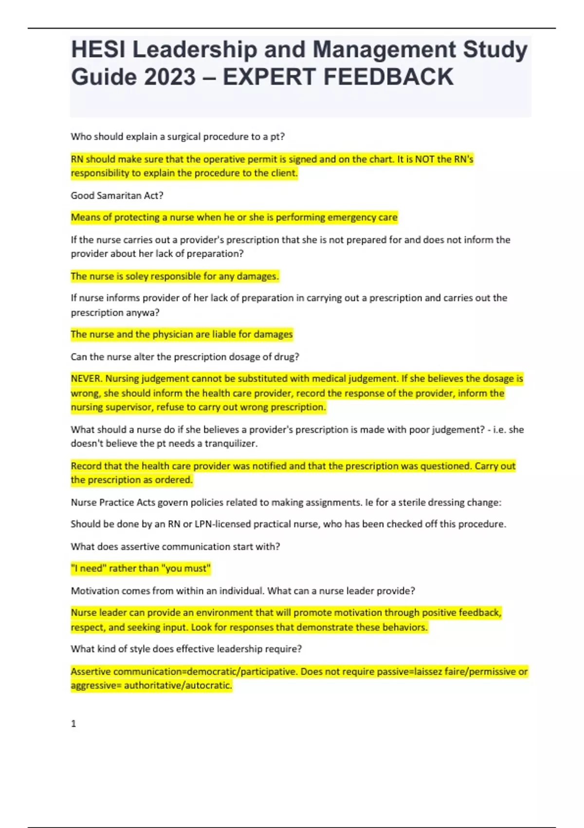 HESI Leadership and Management Study Guide 2023 – EXPERT FEEDBACK
