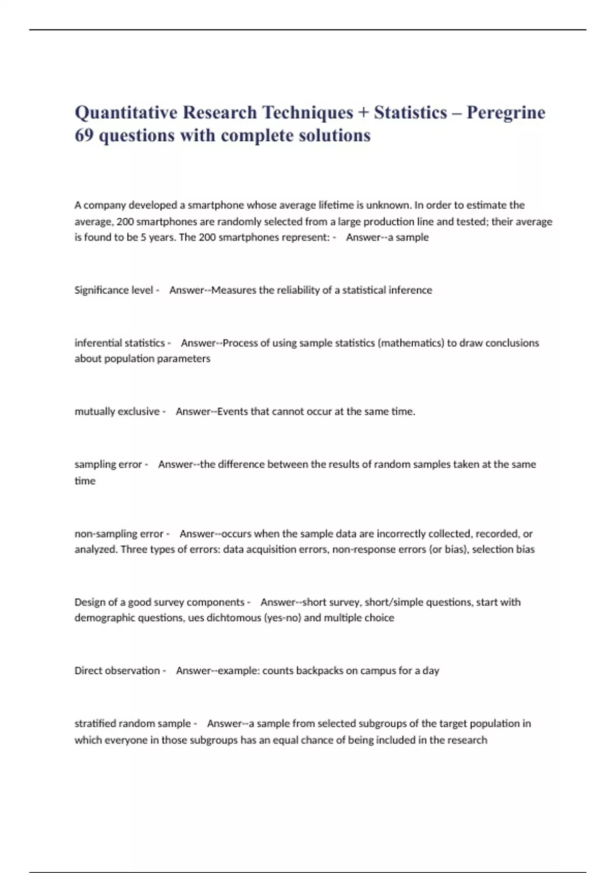 Quantitative Research Techniques + Statistics – Peregrine 69 questions with complete solutions