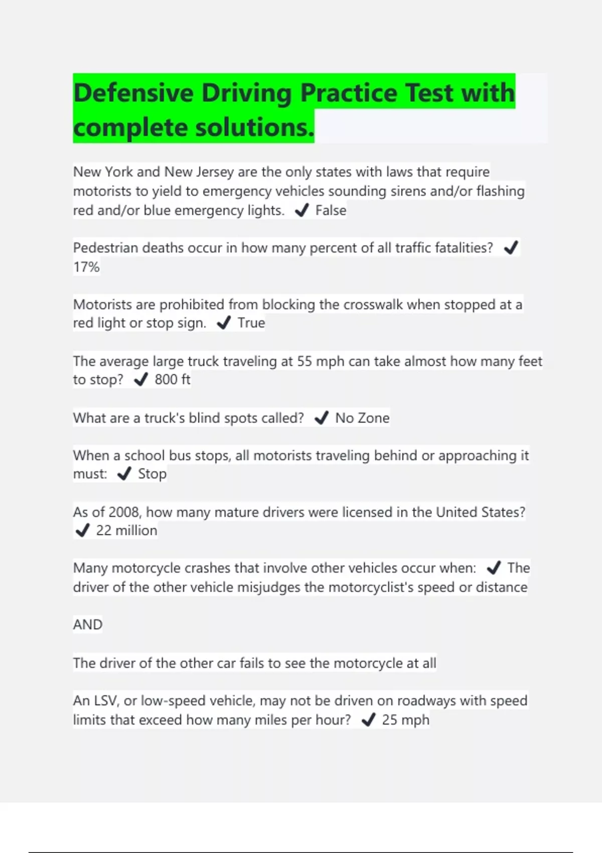 Defensive Driving Practice Test with complete solutions. New York and New Jersey are the only states with laws that require motorists to yield to emergency vehicles sounding sirens and/or flashing red and/or blue emergency lights. ️ False Pedestrian deaths occur in how many percent of all traffic fatalities? ️ 17% Motorists are prohibited from blocking the crosswalk when stopped at a red light or stop sign. ️ True The average large truck traveling at 55 mph can take almost how many feet to stop? ️ 800 ft What are a truck's blind spots called? ️ No Zone When a school bus stops, all motorists traveling behind or approaching it must: ️ Stop As of 2008, how many mature drivers were licensed in the United States? ️ 22 million Many motorcycle crashes that involve other vehicles occur when: ️ The driver of the other vehicle misjudges the motorcyclist's speed or distance AND The driver of the other car fails to see the motorcycle at all An LSV, or low-speed vehicle, may not be driven on roadways with speed limits that exceed how many miles per hour? ️ 25 mph
