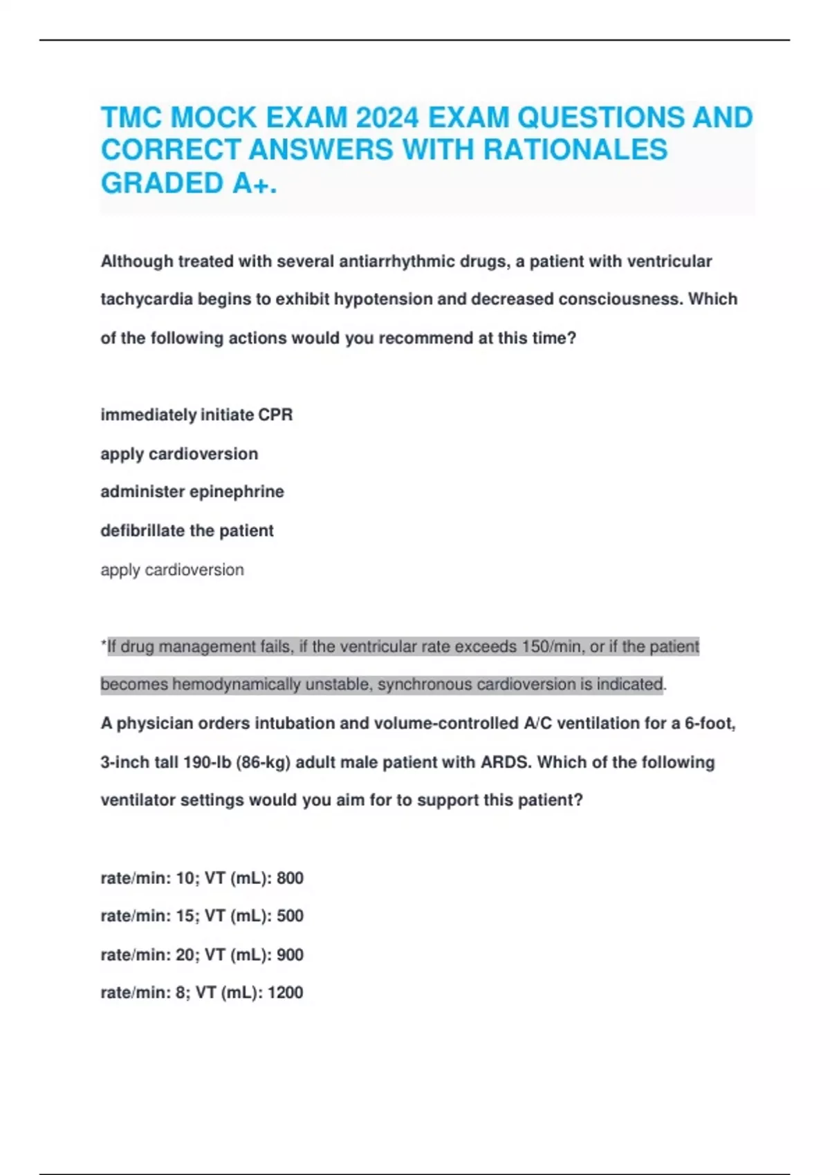TMC MOCK EXAM 2024 EXAM QUESTIONS AND CORRECT ANSWERS WITH RATIONALES GRADED A+. Although treated with several antiarrhythmic drugs, a patient with ventricular tachycardia begins to exhibit hypotension and decreased consciousness. Which of the following actions would you recommend at this time? immediately initiate CPR apply cardioversion administer epinephrine defibrillate the patient apply cardioversion *If drug management fails, if the ventricular rate exceeds 150/min, or if the patient becomes hemodynamically unstable, synchronous cardioversion is indicated. A physician orders intubation and volume-controlled A/C ventilation for a 6-foot, 3-inch tall 190-lb (86-kg) adult male patient with ARDS. Which of the following ventilator settings would you aim for to support this patient? rate/min: 10; VT (mL): 800 rate/min: 15; VT (mL): 500 rate/min: 20; VT (mL): 900 rate/min: 8; VT (mL): 1200 TMC MOCK EXAM 2024 EXAM QUESTIONS AND CORRECT ANSWERS WITH RATIONALES GRADED A+. rate/min: 15; VT (mL): 500 Tidal volume 6ml/kg IBW 6ft 3= 85kg IBW Vt= 500 Rate= 10 to 20 A doctor institutes volume-controlled ventilation for a 70-kg ARDS patient with a targeted tidal volume of 420 mL To maintain adequate ventilation with this tidal volume, the maximum respiratory rate you would allow is: 25/min 35/min 20/min 30/min 35/min