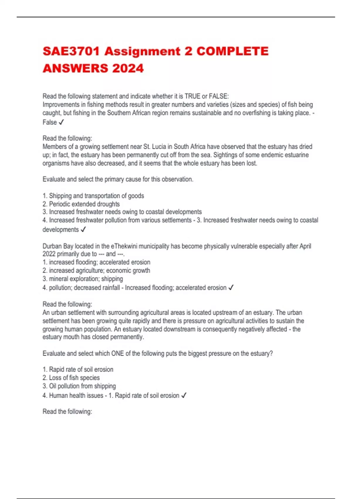 SAE3701 Assignment 2 COMPLETE ANSWERS 2024 Read the following statement and indicate whether it is TRUE or FALSE: Improvements in fishing methods result in greater numbers and varieties (sizes and species) of fish being caught, but fishing in the Southern African region remains sustainable and no overfishing is taking place. - False Read the following: Members of a growing settlement near St. Lucia in South Africa have observed that the estuary has dried up; in fact, the estuary has been permanently cut off from the sea. Sightings of some endemic estuarine organisms have also decreased, and it seems that the whole estuary has been lost. Evaluate and select the primary cause for this observation. 1. Shipping and transportation of goods 2. Periodic extended droughts 3. Increased freshwater needs owing to coastal developments 4. Increased freshwater pollution from various settlements - 3. Increased freshwater needs owing to coastal developments Durban Bay located in the eThekwini municipality has become physically vulnerable especially after April 2022 primarily due to --- and ---. 1. increased flooding; accelerated erosion 2. increased agriculture; economic growth 3. mineral exploration; shipping 4. pollution; decreased rainfall - Increased flooding; accelerated erosion Read the following: An urban settlement with surrounding agricultural areas is located upstream of an estuary. The urban settlement has been growing quite rapidly and there is pressure on agricultural activities to sustain the growing human population. An estuary located downstream is consequently negatively affected - the estuary mouth has closed permanently. Evaluate and select which ONE of the following puts the biggest pressure on the estuary? 1. Rapid rate of soil erosion 2. Loss of fish species 3. Oil pollution from shipping 4. Human health issues - 1. Rapid rate of soil erosion Read the following: Recent reports focused on the assessment of water quality of some of South Africa's major beaches. The reports have shown a general downward trend in the standard of wa