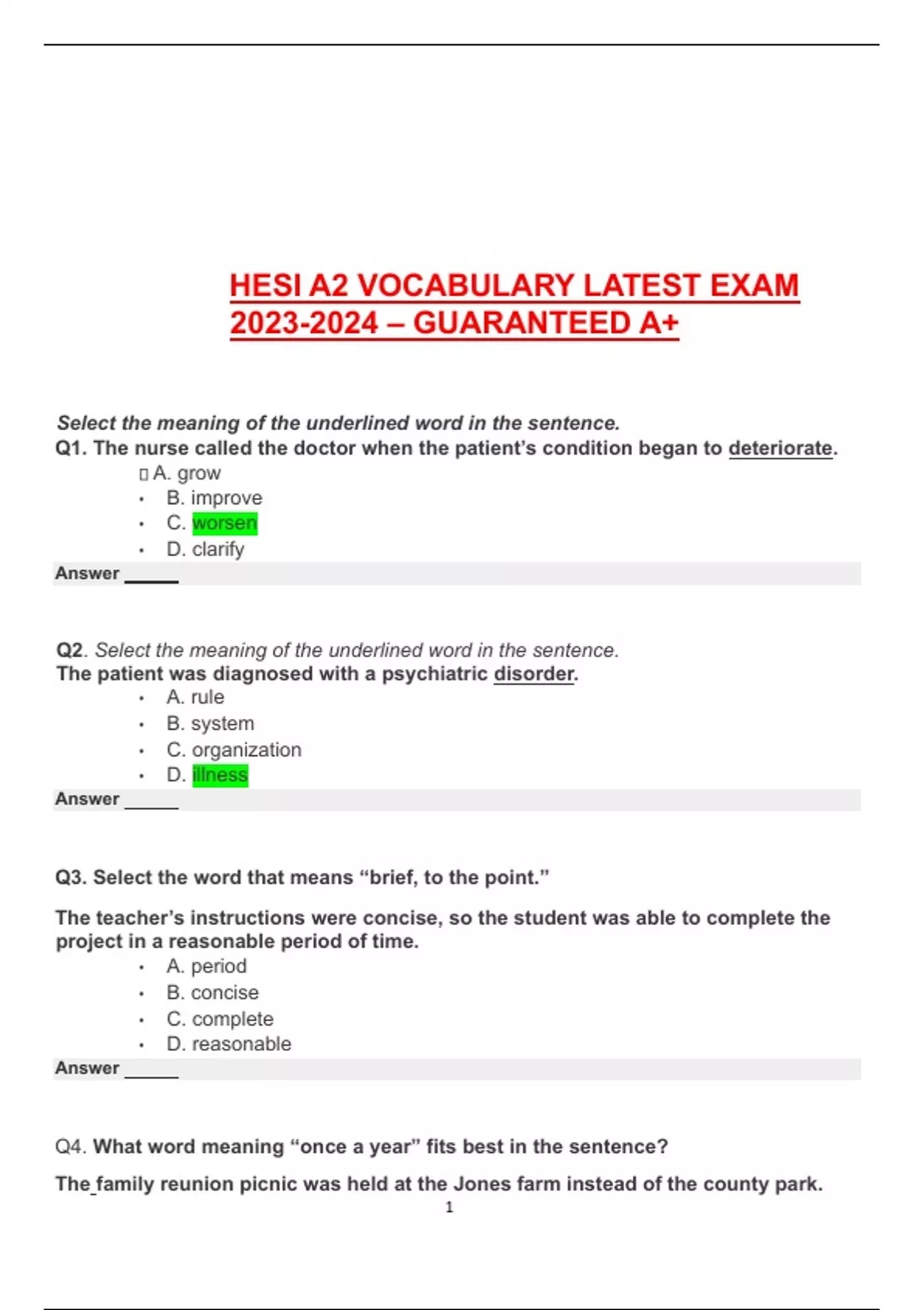 HESI A2 VOCABULARY LATEST EXAM – GUARANTEED A+