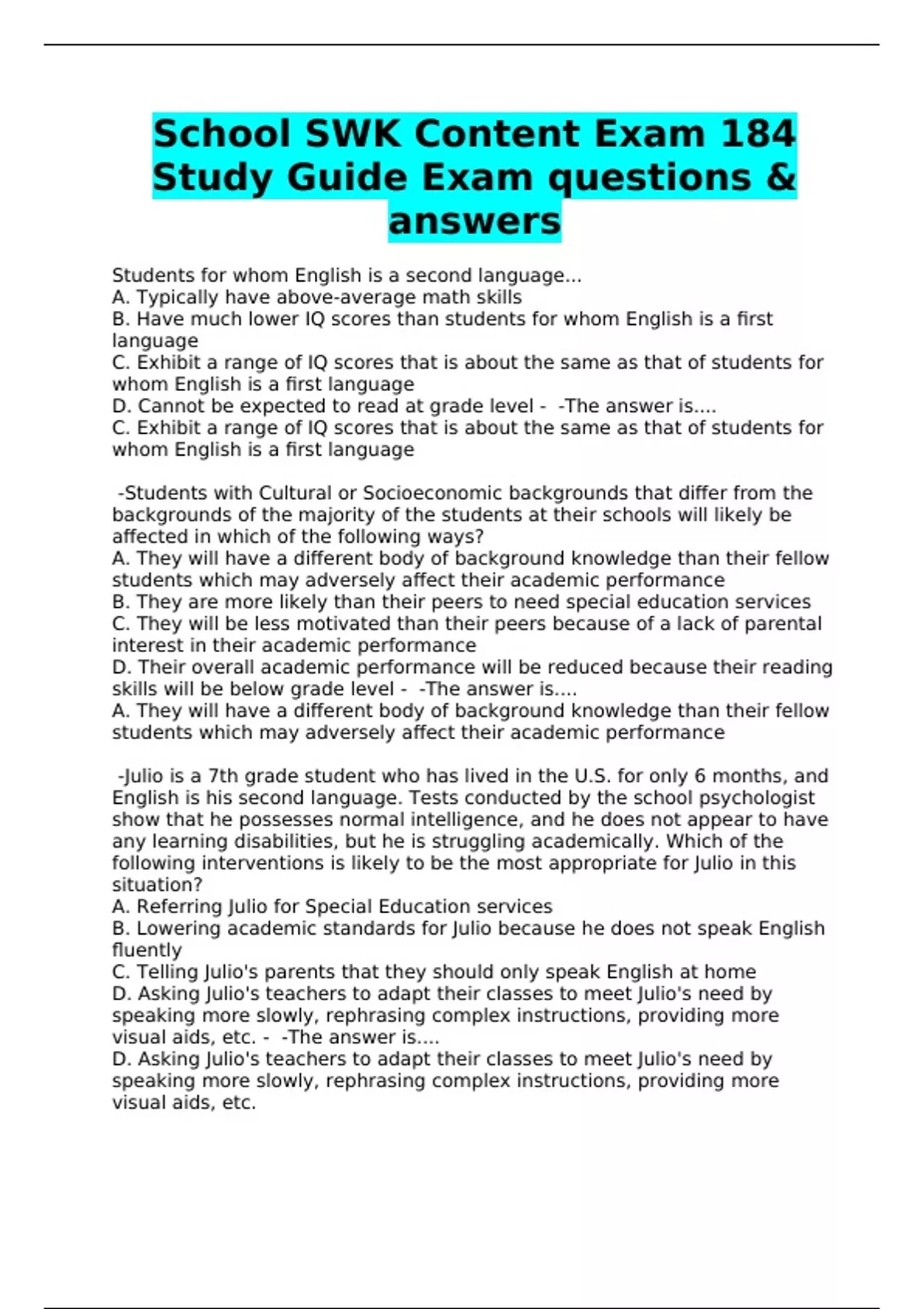 School SWK Content Exam 184 Study Guide Exam questions & answers