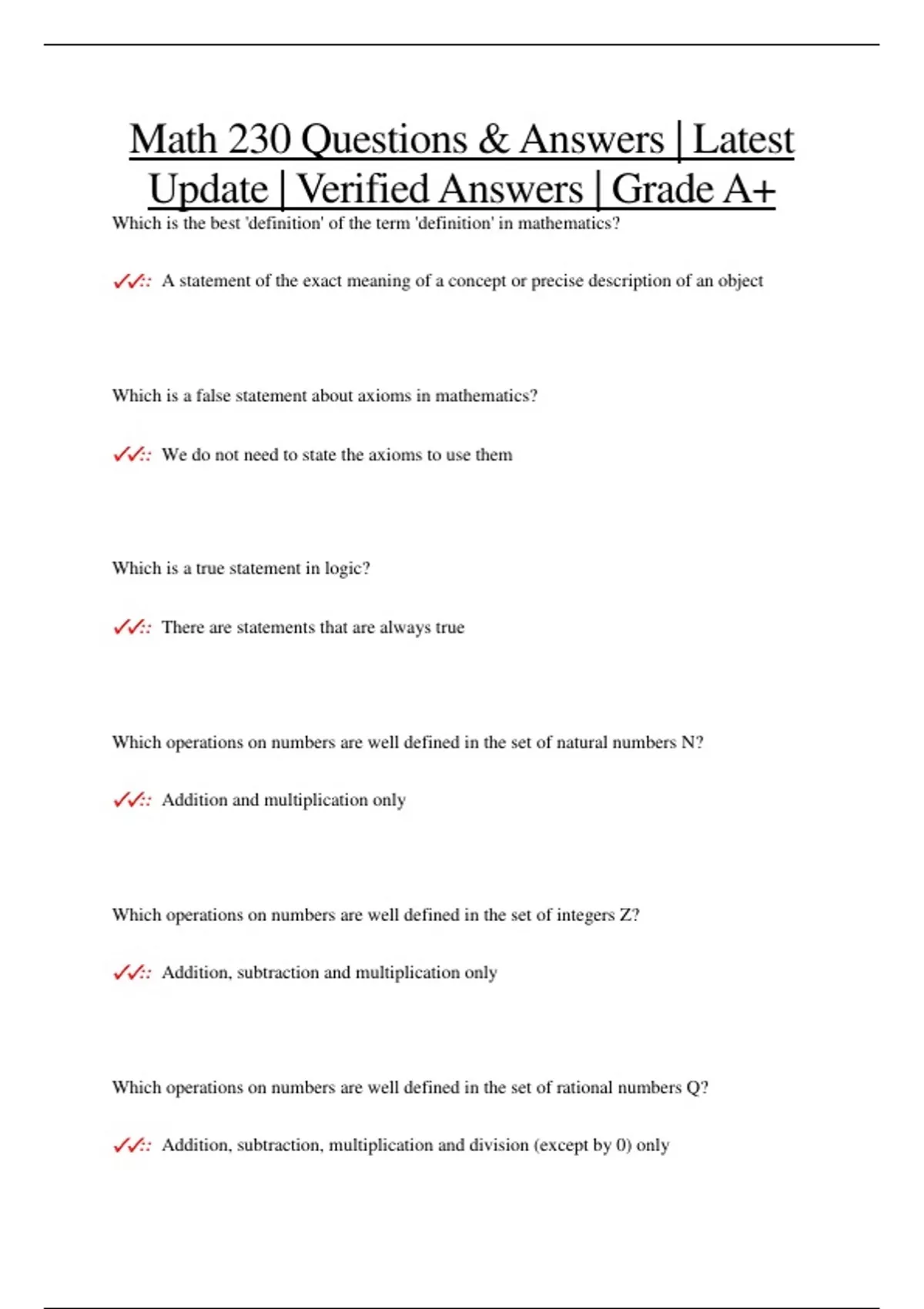 Math 230 Questions & Answers | Latest Update | Verified Answers | Grade A+