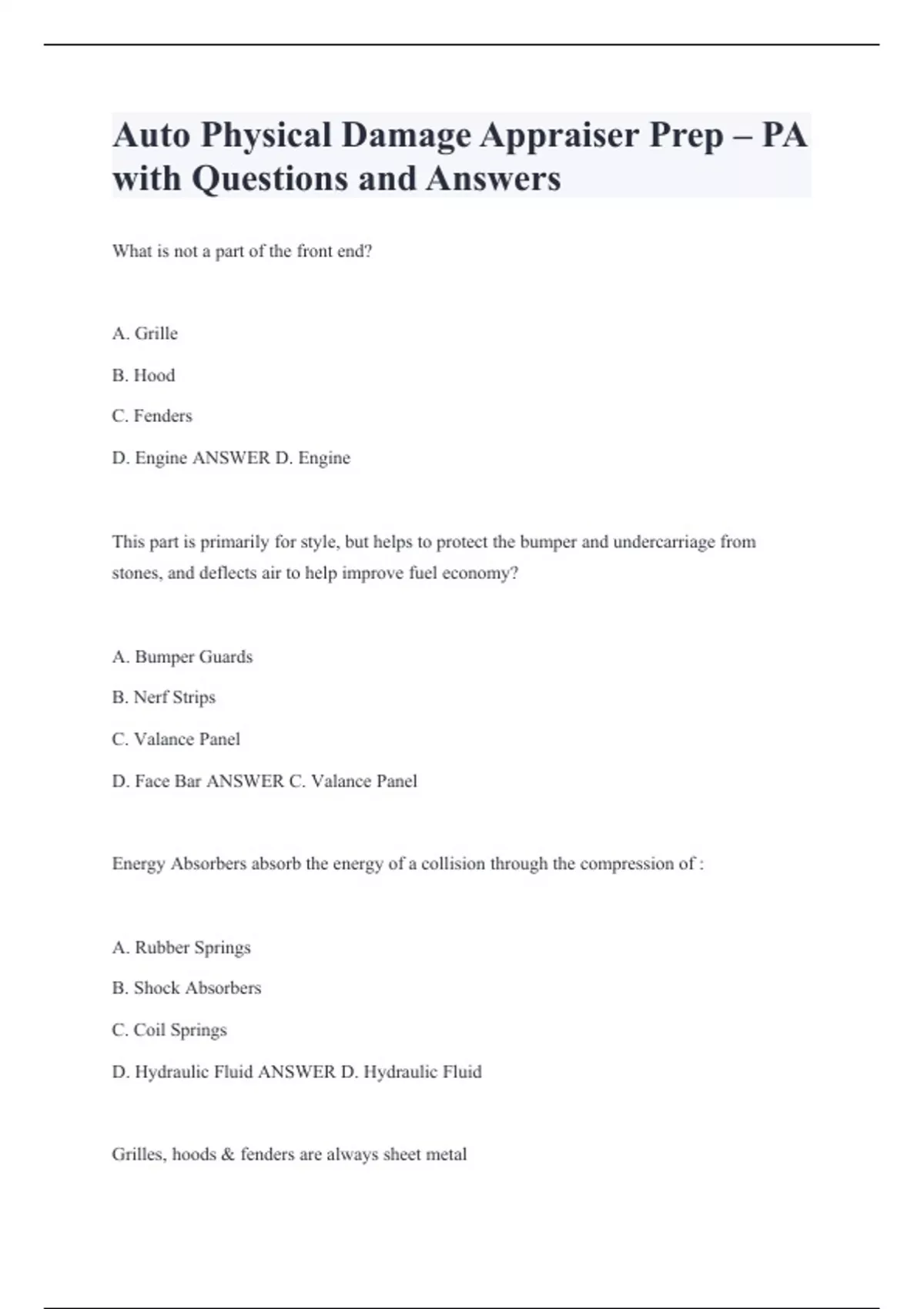 Auto Physical Damage Appraiser Prep – PA with Questions and Answers What is not a part of the front end? A. Grille B. Hood C. Fenders D. Engine ANSWER D. Engine This part is primarily for style, but helps to protect the bumper and undercarriage from stones, and deflects air to help improve fuel economy? A. Bumper Guards B. Nerf Strips C. Valance Panel D. Face Bar ANSWER C. Valance Panel Energy Absorbers absorb the energy of a collision through the compression of : A. Rubber Springs B. Shock Absorbers C. Coil Springs D. Hydraulic Fluid ANSWER D. Hydraulic Fluid Grilles, hoods & fenders are always sheet metal