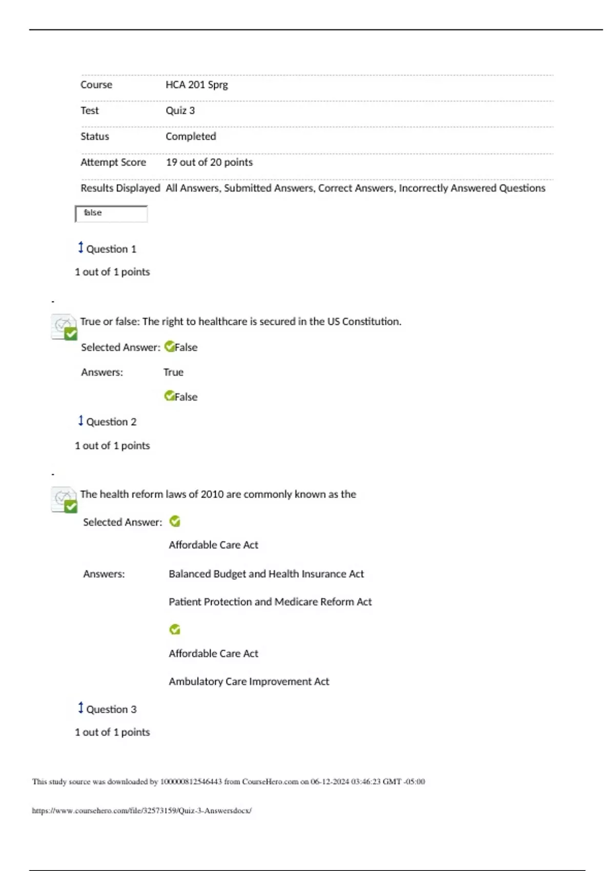 esults DisplayedAll Answers, Submitted Answers, Correct Answers, Incorrectly Answered QuestionsfalseQuestion 1 1 out of 1 points True or false: The right to healthcare is secured in the US Constitution.Selected Answer:FalseAnswers: True False Question 2 1 out of 1 pointsThe health reform laws of 2010 are commonly known as theSelected A