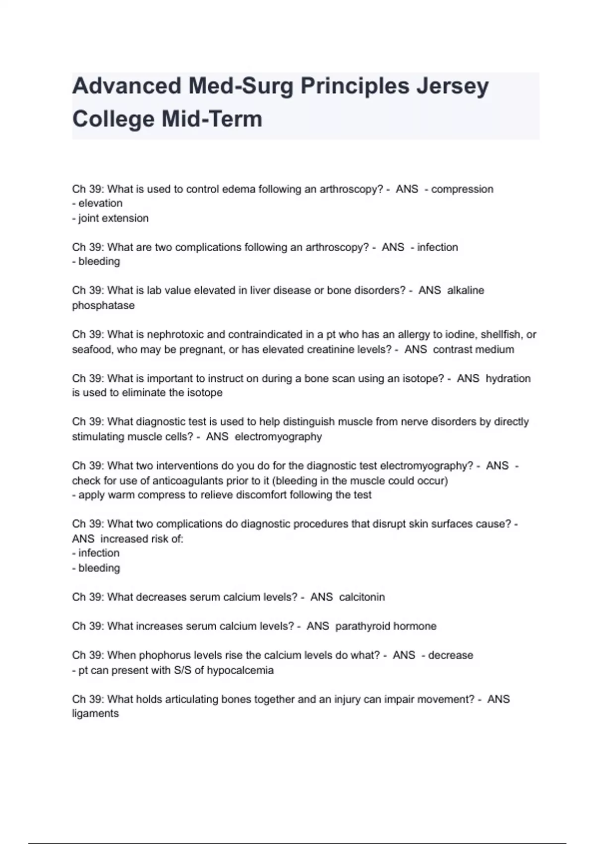 Advanced Med-Surg Principles Jersey College Mid-Term Exam Questions And Answers A+ Graded Ch 39: What is used to control edema following an arthroscopy? - ANS - compression - elevation - joint extension Ch 39: What are two complications following an arthroscopy? - ANS - infection - bleeding Ch 39: What is lab value elevated in liver disease or bone disorders? - ANS alkaline phosphatase Ch 39: What is nephrotoxic and contraindicated in a pt who has an allergy to iodine, shellfish, or seafood, who may be pregnant, or has elevated creatinine levels? - ANS contrast medium Ch 39: What is important to instruct on during a bone scan using an isotope? - ANS hydration is used to eliminate the isotope Ch 39: What diagnostic test is used to help distinguish muscle from nerve disorders by directly stimulating muscle cells? - ANS electromyography Ch 39: What two interventions do you do for the diagnostic test electromyography? - ANS - check for use of anticoagulants prior to it (bleeding in the muscle could occur) - apply warm compress to relieve discomfort following the test Ch 39: What two complications do diagnostic procedures that disrupt skin surfaces cause? - ANS increased risk of: - infection - bleeding Ch 39: What decreases serum calcium levels? - ANS calcitonin Ch 39: What increases serum calcium levels? - ANS parathyroid hormone Ch 39: When phophorus levels rise the calcium levels do what? - ANS - decrease - pt can present with S/S of hypocalcemia Ch 39: What holds articulating bones together and an injury can impair movement? - ANS ligaments Ch 39: What connects muscle to bone and an injury can impair movement? - ANS tendons Ch 39: What can helo support bone formation? - ANS - weight bearing exercises - sex hormones - calcitonin - calcium intake Ch 39: Adults over 50 require how much Vit D daily to help prevent osteoporosis? - ANS 800 - 1000 IU Ch 39: What is important to instruct pts on consuming in regards to helping to prevent osteoporosis? - ANS - 1,200 mg of calcium daily - 600 IU Vit D daily (with intake of low-fat milk, yogart, and cheese) Ch 39: What can increase bone resorption and could lead to osteoporosis? - ANS - excessive cortisol production - excessive thyroid hormone production Ch 39: What stimulates osteoblastic (bone formation) activity and inhibits osteoclastic (bone resorption) activity? - ANS estrogen Ch 39: Compromised estrogen levels in menopause can increase the risk of? - ANS osteoporosis Ch 39: What two things can result in a loss in height? - ANS - vertebral fractures - loss vertebral cratilage Ch 40: Because external fixators increase the risk for osteomyelitis you should do what for the pt? - ANS perform pin site care using the aseptic technique (use chlorhexidine 2 mg/mL solution unless contraindicated)