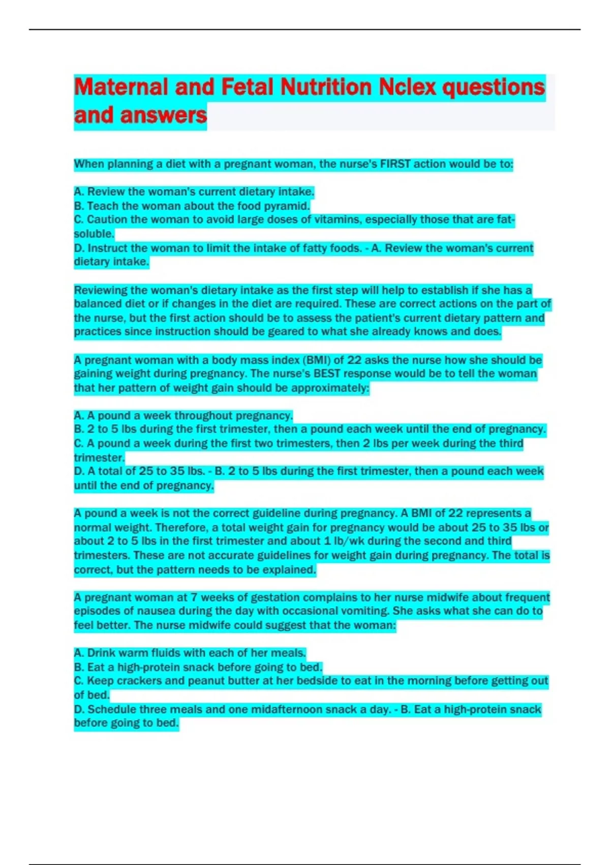 Maternal and Fetal Nutrition Nclex questions and answers When planning a diet with a pregnant woman, the nurse's FIRST action would be to: A. Review the woman's current dietary intake. B. Teach the woman about the food pyramid. C. Caution the woman to avoid large doses of vitamins, especially those that are fatsoluble. D. Instruct the woman to limit the intake of fatty foods. - A. Review the woman's current dietary intake. Reviewing the woman's dietary intake as the first step will help to establish if she has a balanced diet or if changes in the diet are required. These are correct actions on the part of the nurse, but the first action should be to assess the patient's current dietary pattern and practices since instruction should be geared to what she already knows and does. A pregnant woman with a body mass index (BMI) of 22 asks the nurse how she should be gaining weight during pregnancy. The nurse's BEST response would be to tell the woman that her pattern of weight gain should be approximately: A. A pound a week throughout pregnancy. B. 2 to 5 lbs during the first trimester, then a pound each week until the end of pregnancy. C. A pound a week during the first two trimesters, then 2 lbs per week during the third trimester. D. A total of 25 to 35 lbs. - B. 2 to 5 lbs during the first trimester, then a pound each week until the end of pregnancy. A pound a week is not the correct guideline during pregnancy. A BMI of 22 represents a normal weight. Therefore, a total weight gain for pregnancy would be about 25 to 35 lbs or about 2 to 5 lbs in the first trimester and about 1 lb/wk during the second and third trimesters. These are not accurate guidelines for weight gain during pregnancy. The total is correct, but the pattern needs to be explained. A pregnant woman at 7 weeks of gestation complains to her nurse midwife about frequent episodes of nausea during the day with occasional vomiting. She asks what she can do to feel better. The nurse midwife could suggest that the woman: A. Drink warm fluids with each of her meals. B. Eat a high-protein snack before going to bed. C. Keep crackers and peanut butter at her bedside to eat in the morning before getting out of bed. D. Schedule three meals and one midafternoon snack a day. - B. Eat a high-protein snack before going to bed. Fluids should be taken between (not with) meals to provide for maximum nutrient uptake in the small intestine. A bedtime snack of slowly digested protein is especially important to prevent the occurrence of hypoglycemia during the night that would contribute to nausea. Dry carbohydrates such as plain toast or crackers are recommended before getting out of bed. Eating small, frequent meals (about five or six each day) with snacks helps to avoid a distended or empty stomach, both of which contribute to the development of nausea and vomiting. A pregnant woman experiencing nausea and vomiting should: A. Drink a glass of water with a fat-free carbohydrate before getting out of bed in the morning. B. Eat small, frequent meals (every 2 to 3 hours). C. Increase her intake of high-fat foods to keep the stomach full and coated. D. Limit fluid intake throughout the day. - B. Eat small, frequent meals (every 2 to 3 hours). A pregnant woman experiencing nausea and vomiting should avoid consuming fluids early in the day or when nauseated. This is a correct suggestion for a woman experiencing nausea and vomiting. A pregnant woman experiencing nausea and vomiting should reduce her intake of fried foods and other fatty foods. A pregnant woman experiencing nausea and vomiting should avoid consuming fluids early in the morning or when nauseated but should compensate by drinking fluids at other times. A pregnant woman reports that she is still playing tennis at 32 weeks of gestation. The nurse would be most concerned regarding what this woman consumes during and after tennis matches. Which is the MOST important? A. Several glasses of fluid B. Extra protein sources, such as peanut butter C. Salty foods to replace lost sodium D. Easily digested sources of carbohydrate - A. Several glasses of fluid If no medical or obstetric problems contraindicate physical activity, pregnant women should get 30 minutes of moderate physical exercise daily. Liberal amounts of fluid should be consumed before, during, and after exercise, because dehydration can trigger premature labor. Also the woman's calorie intake should be sufficient to meet the increased needs of pregnancy and the demands of exercise. All pregnant women should consume the necessary amount of protein in their diet, regardless of level of activity. Many pregnant women of this gestation tend to retain fluid. This may contribute to hypertension and swelling. An adequate fluid intake prior to and after exercise should be sufficient. The woman's calorie and carbohydrate intake should be sufficient to meet the increased needs