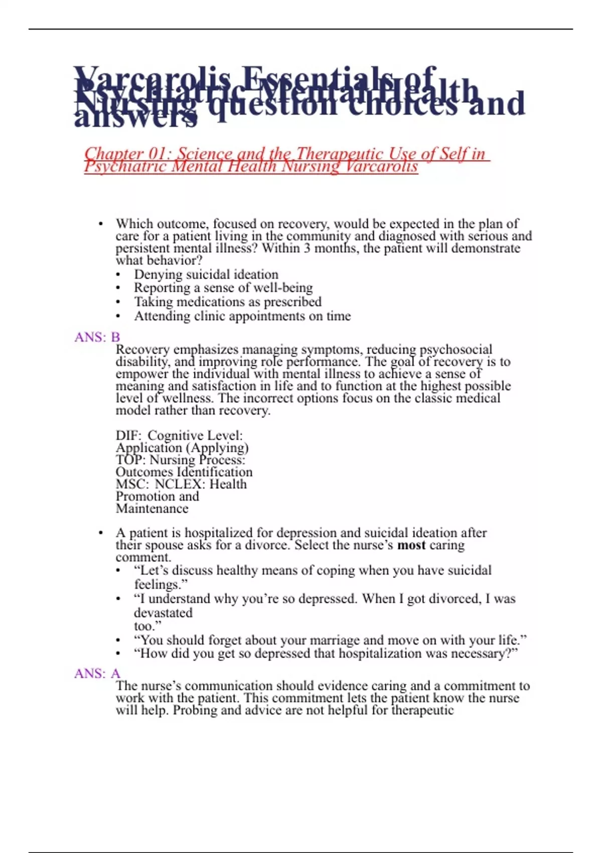 Chapter 01: Science and the Therapeutic Use of Self in Psychiatric Mental Health Nursing Varcarolis Which outcome, focused on recovery, would be expected in the plan of care for a patient living in the community and diagnosed with serious and persistent mental illness? Within 3 months, the patient will demonstrate what behavior? Denying suicidal ideation Reporting a sense of well-being Taking medications as prescribed Attending clinic appointments on time ANS: B Recovery emphasizes managing symptoms, reducing psychosocial disability, and improving role performance. The goal of recovery is to empower the individual with mental illness to achieve a sense of meaning and satisfaction in life and to function at the highest possible level of wellness. The incorrect options focus on the classic medical model rather than recovery. DIF: Cognitive Level: Application (Applying) TOP: Nursing Process: Outcomes Identification MSC: NCLEX: Health Promotion and Maintenance A patient is hospitalized for depression and suicidal ideation after their spouse asks for a divorce. Select the nurse’s most caring comment. “Let’s discuss healthy means of coping when you have suicidal feelings.” “I understand why you’re so depressed. When I got divorced, I was devastated too.” “You should forget about your marriage and move on with your life.” “How did you get so depressed that hospitalization was necessary?” ANS: A The nurse’s communication should evidence caring and a commitment to work with the patient. This commitment lets the patient know the nurse will help. Probing and advice are not helpful for therapeutic interventions. DIF: Cognitive Level: Application (Applying) TOP: Nursing Process: Implementation MSC: NCLEX: Psychosocial Integrity In the shift-change report, an off-going nurse criticizes a patient who wears extremely heavy makeup. Which comment by the nurse who receives the report best demonstrates advocacy? “This is a psychiatric hospital, so we expect our patients to behave bizarrely.” “Let’s all show acceptance of this patient by wearing lots of makeup too.” “Your comments are inconsiderate and inappropriate. Keep the report objective.” “Our patients need our help to learn behaviors that will help them get along in society.” ANS: D Accepting patients’ needs for self-expression and seeking to teach skills that will contribute to their well-being demonstrate respect and are important parts of advocacy. The on-coming nurse needs to take action to ensure that others are not prejudiced against the patient. Humor can be appropriate within the privacy of a shift report but not at the expense of respect for patients. Judging the off-going nurse in a critical way will create conflict. Nurses must show compassion for each other. DIF: Cognitive Level: Application (Applying) TOP: Nursing Process: Implementation MSC: NCLEX: Safe, Effective Care Environment A nurse assesses a newly admitted patient diagnosed with major depressive disorder. Which statement is an example of “attending”? “We all have stress in life. Being in a psychiatric hospital is not the end of the world.” “Tell me why you felt you had to be hospitalized to receive treatment for your depression.” “You will feel better after we get some antidepressant medication started for you.” “I’d like to sit with you for a while, so you may feel more comfortable talking with me.” ANS: D Attending is a technique that demonstrates the nurse’s commitment to the relationship and reduces feelings of isolation. This technique shows respect for the patient and demonstrates caring. Generalizations, probing, and false reassurances are nontherapeutic. DIF: Cognitive Level: Application (Applying) TOP: Nursing Process: Implementation MSC: NCLEX: Psychosocial Integrity A patient shows the nurse an article from the Internet about a health problem. Which characteristic of the website’s address most alerts the nurse that the site may have biased and prejudiced information? Address ends in “.org.” Address ends in “.com.” Address ends in “.gov.” Address ends in “.net.” ANS: B Financial influences on a site are a clue that the information may be biased. “.com” at the end of the address indicates that the site is a commercial one. “.gov” indicates that the site is maintained by a government entity. “.org” indicates that the site is nonproprietary; the site may or may not have reliable information, but it does not profit from its activities. “.net” can have multiple meanings. DIF: Cognitive Level: Comprehension (Understanding) TOP: Nursing Process: Evaluation MSC: NCLEX: Health Promotion and Maintenance A nurse says, “When I was in school, I learned to call upset patients by name to get their attention; however, I read a descriptive research study that says that this approach does not work. I plan to stop calling patients by name.” Which statement is the best appraisal of this nurse’s comment? One descriptive research study rarely provides enough evidence to change practice. Staff nurses apply new research findings only with the help from clinical nurse specialists. New research findings should be incorporated into clinical algorithms before using them in practice. The nurse misinterpreted the results of the study. Classic tenets of practice do not change. ANS: A Descriptive research findings provide evidence for practice but must be viewed in relation to other studies before practice changes. One study is not enough. Descriptive studies are low on the hierarchy of evidence. Clinical algorithms use flowcharts to manage problems and do not specify one response to a clinical problem. Classic tenets of practice should change as research findings provide evidence for change. DIF: Cognitive Level: Analysis (Analyzing) TOP: Nursing Process: Evaluation MSC: NCLEX: Health Promotion and Maintenance Two nursing students discuss career plans after graduation. One student wants to ente