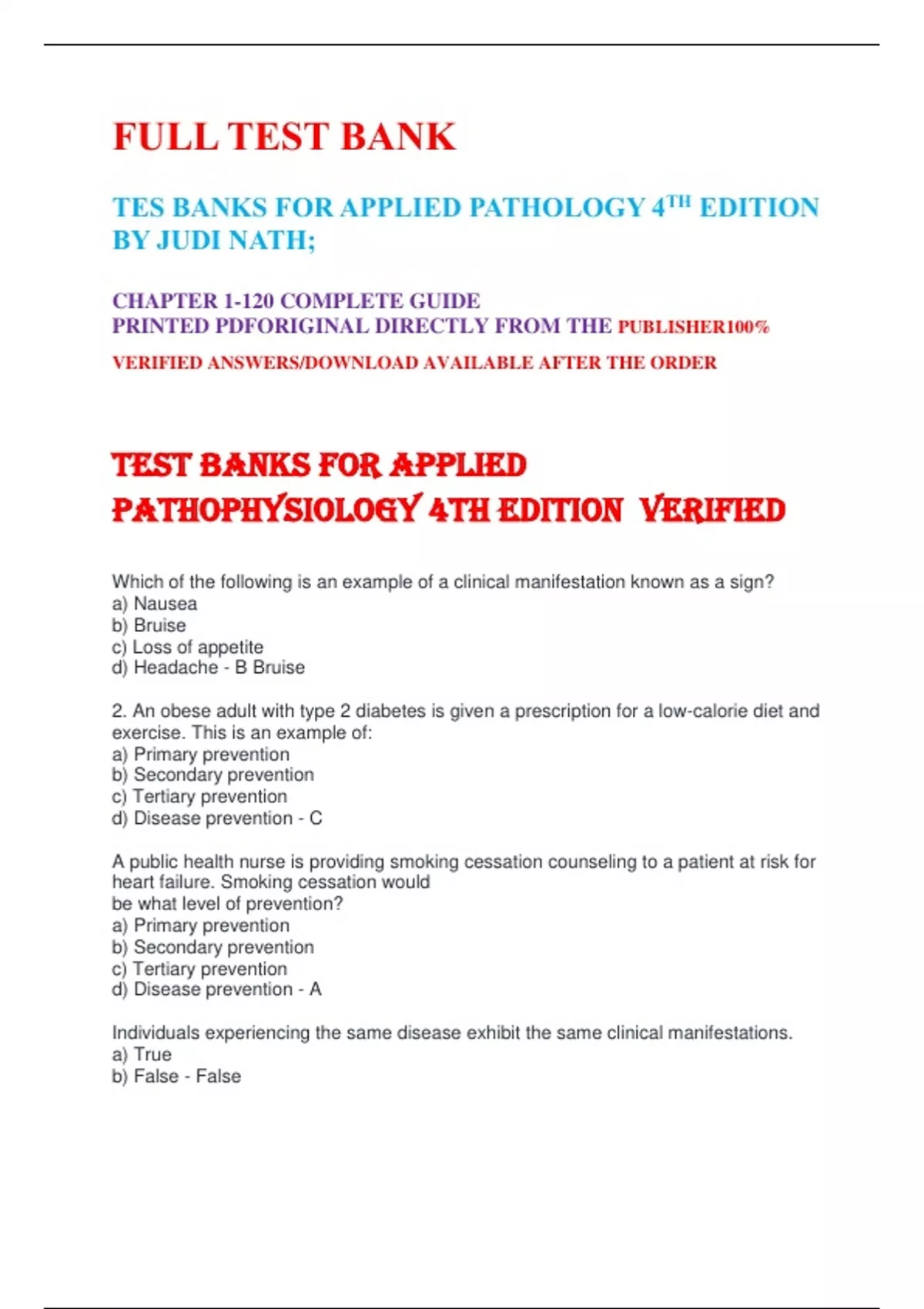 Test Banks For Applied Pathophysiology 4th Edition verified Which of the following is an example of a clinical manifestation known as a sign? a) Nausea b) Bruise c) Loss of appetite d) Headache - B Bruise 2. An obese adult with type 2 diabetes is given a prescription for a low-calorie diet and exercise. This is an example of: a) Primary prevention b) Secondary prevention c) Tertiary prevention d) Disease prevention - C A public health nurse is providing smoking cessation counseling to a patient at risk for heart failure. Smoking cessation would be what level of prevention? a) Primary prevention b) Secondary prevention c) Tertiary prevention d) Disease prevention - A Individuals experiencing the same disease exhibit the same clinical manifestations. a) True b) False - False Which of the following would be a non-modifiable risk factor for heart disease? a) Smoking b) Obesity c) Elevated blood pressure d) Family history - D A change in physiologic variable is more important than the absolute values. a) True b) False - True A member of the health care team is researching the etiology and pathogenesis of a number of clients who are under his care in a hospital context. Which of the following aspects of clients' situations best characterizes pathogenesis rather than etiology? A client: a) Who has been exposed to the Mycobacterium tuberculosis bacterium b) Who has increasing serum ammonia levels due to liver cirrhosis c) Who was admitted with the effects of methyl alcohol poisoning d) With multiple skeletal injuries secondary to a motor vehicle accident - B A test reports that 99.8% of patients who have confirmed cardiac etiologies test positive in the test, however 11.3% of patients who don't have cardiac etiologies for their shortness of breath also test positive. Which of the following statements best characterizes this blood test? a) Low sensitivity, high specificity b) High sensitivity, low specificity c) Low reliability, high validity d) High reliability, low validity - B The nurse is examining the results of the bronchoscopy of a chronic smoker. The report showed stratified squamous cells as opposed to columnar ciliated cells. The nurse understands that this is which type of cellular adaptation? a) Hyperplasia b) Metaplasia c) Dysplasia d) Anaplasia - B Which of the following clients is most likely to experience muscle hypertrophy? A client with: a) Hypertension, obesity, and decreased activity tolerance b) Urinary incontinence following a cerebral vascular accident c) Peripheral edema secondary to heart failure d) Possible rejection symptoms following a liver transplant - A A patient returns to the clinic for her Pap smear results, which reveal cervical dysplasia. Which of the following statements if made by the nurse accurately describes the condition? a) "Some cells in your cervix have increased in size." b) "There are anaplastic changes in the nucleus of some of your cells." c) "Some cells in your cervix have become immature." d) "Some of your cervical cells have become cancerous." - C Which of the following cellular accumulations is indicative of injury due to faulty metabolism? a) Hydropic swelling b) Lactate production c) Metaplasia d) Intracellular accumulations - D Which of the following cellular accumulations is indicative of injury due to faulty metabolism? a) Hydropic swelling b) Lactate production c) Metaplasia d) Intracellular accumulations - C Which of the following is occurring inside of cells while they are not receiving enough oxygen due to ischemia? Select all that apply. a) Increased intracellular potassium b) Increased intracellular calcium c) Increased intracellular sodium d) Increased intracellular magnesium - B,C The type of irreversible injury that initiates an inflammatory response is called apoptosis. a) True b) False - False