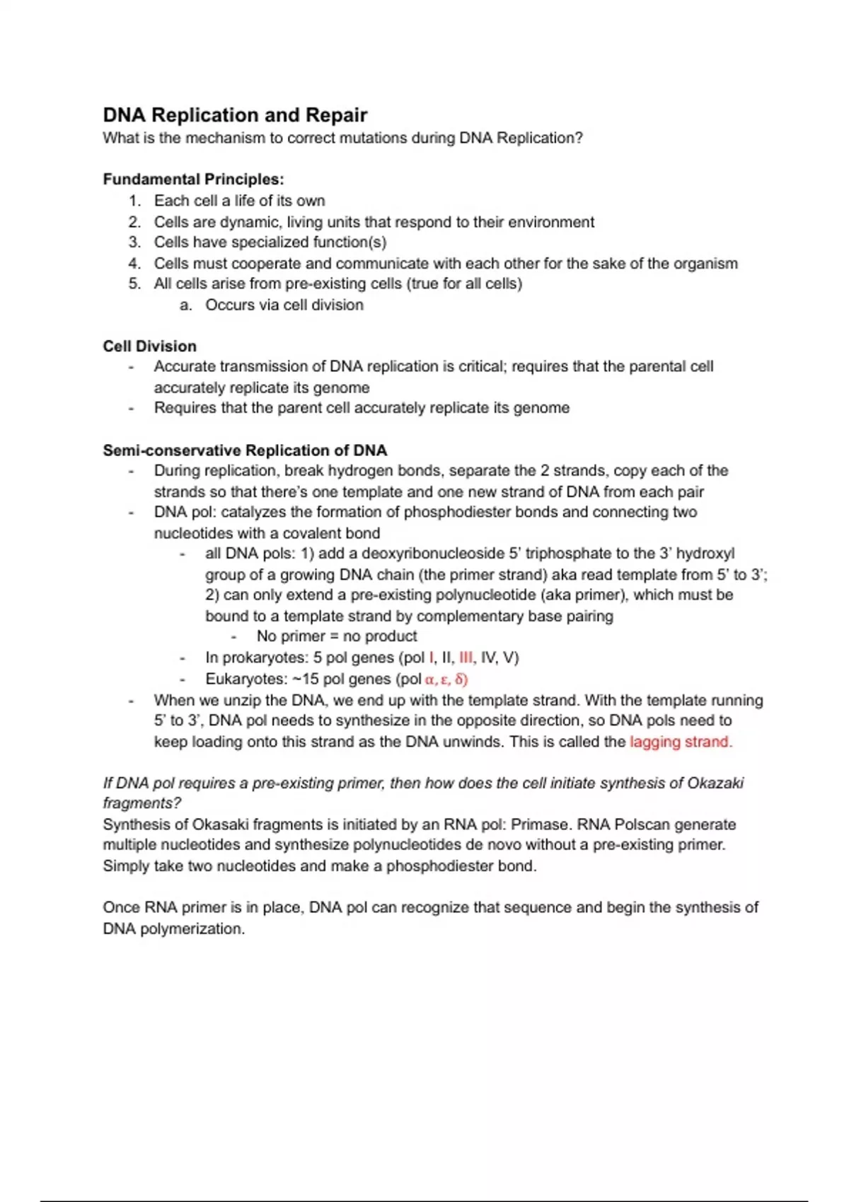 26 page document focusing on topics learned in Boston Uni Unit 2 Cell Biology course, including: DNA replication, endo/exonucleases, proteins (i.e. ssB, sliding-clamp, clamp-loading, etc.), topoisomerases, telomeres, ensuring accuracy of DNA replication, photoreactivation, mismatch repair in prokaryotes vs eukaryotes, base excision repair, nucleotide excision repair, DNA rearrangements and recombinations, DNA aplification, hypermutation, RNA polymerases, mRNA processing, etc. At the end are some definitions of various enzymes, proteins, etc. (i.e. NELF, P-TEFb, eIF5-B, chromatin remodeling factor, HDACs, stop codons, RNAi, chaperones, Hsp70, Ran-GAP, ARf, RAB, vesicle docking, ERAD, etc. good for exam studies or some more in depth review for MCAT Biology Poses questions throughout to think about with some explanations.
