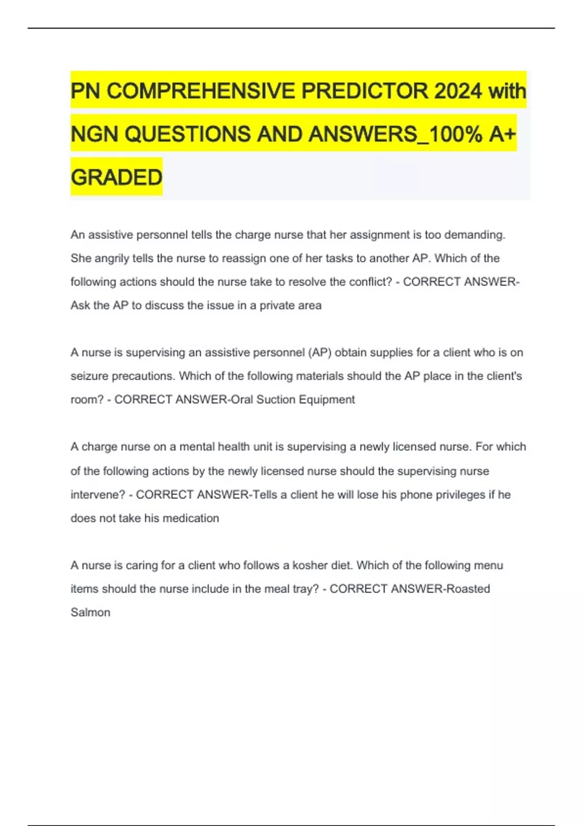 PN COMPREHENSIVE PREDICTOR 2024 with NGN QUESTIONS AND ANSWERS_100% A+ GRADED An assistive personnel tells the charge nurse that her assignment is too demanding. She angrily tells the nurse to reassign one of her tasks to another AP. Which of the following actions should the nurse take to resolve the conflict? - CORRECT ANSWER-Ask the AP to discuss the issue in a private area A nurse is supervising an assistive personnel (AP) obtain supplies for a client who is on seizure precautions. Which of the following materials should the AP place in the client's room? - CORRECT ANSWER-Oral Suction Equipment A charge nurse on a mental health unit is supervising a newly licensed nurse. For which of the following actions by the newly licensed nurse should the supervising nurse intervene? - CORRECT ANSWER-Tells a client he will lose his phone privileges if he does not take his medication A nurse is caring for a client who follows a kosher diet. Which of the following menu items should the nurse include in the meal tray? - CORRECT ANSWER-Roasted Salmon A nurse is reviewing information about advance directives with a newly admitted client. Which of the following statements by the client indicates an understanding of the information? - CORRECT ANSWER-"Advance directives include a living will" A nurse is collecting data from the caregiver of a client who has Alzheimer's disease. The caregiver reports the client has difficulty sleeping at night and wanders throughout the house. Which of the following interventions should the nurse recommend? - CORRECT ANSWER-Encourage the client to take frequent walks during the day A nurse is assisting in the care of a client who is 8hr postpartum and has uterine atony with increased bleeding. Which of the following actions should the nurse take? (Select all that apply) - CORRECT ANSWER-Assist the client to empty her bladder A nurse is reinforcing teaching with the support person of a client who is in the first stage of labor. Which of the following instructions should the nurse include regarding effleurage? - CORRECT ANSWER-"Gently stroke her abdomen during contractions" A nurse is caring for an older adult client who is postoperative following a total hip arthroplasty. The client is incontinent of stool and urine. Which of the following actions should the nurse take to prevent skin breakdown? - CORRECT ANSWER-Use a moisture barrier on the client's skin A nurse is caring for a client who has terminal cancer. Which of the following actions should the nurse take to promote the client's autonomy? - CORRECT ANSWER-Allow the client to choose treatment times A nurse in a clinic is caring for a client who is at 40 weeks of gestation and experiences a sudden gush of vaginal fluids. Which of the following findings is evidence of an obstetric complication? - CORRECT ANSWER-Appears greenish-brown in color A nurse is assisting with the care of an adolescent client immediately following a lumbar puncture. Which of the following actions should the nurse take? - CORRECT ANSWER-Inform the adolescent that he might experience a headache A nurse is reinforcing teaching about advance directives with a client who has end-stage heart failure. Which of the following statements by the client indicates an understanding of the teaching? - CORRECT ANSWER-"I should discuss this document with my family after I sign it" A nurse is caring for a client who has continuous bladder irrigation following a transurethral resection of the prostate. The nurse notices clots and dark red blood in the catheter collection bag. Which of the following actions should the nurse take? - CORRECT ANSWER-Irrigate the bladder with 20 to 30 mL of 0.9% sodium chloride A nurse is planning to obtain a 12-lead ECG for a client who has a history of cardiac dysrhythmias. Which of the following actions should the nurse plan to take? - CORRECT ANSWER-Instruct the client to remain as still as possible during the recording A nurse is reinforcing teaching with a client who has genital herpes. Which of the following information should the nurse include in the teaching? - CORRECT ANSWER-"You should increase fluid intake to relieve dysuria"