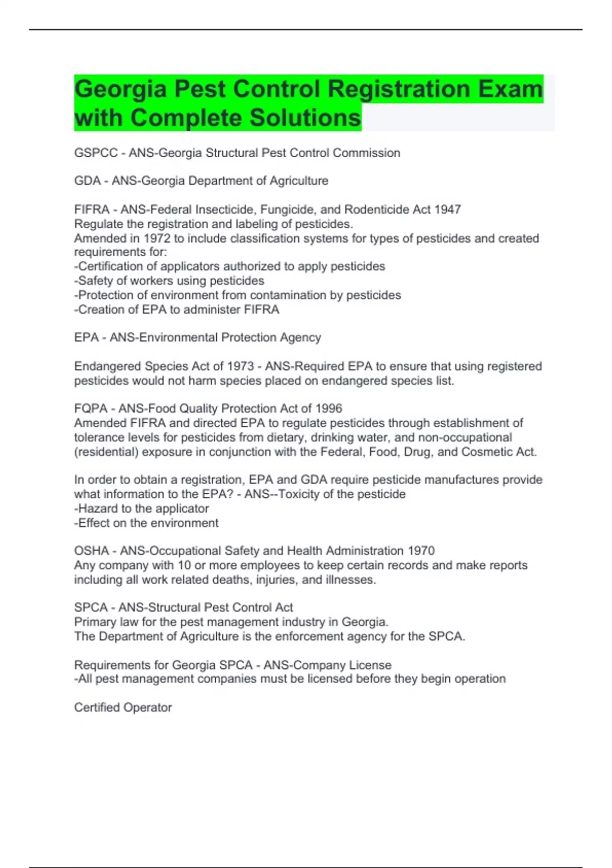 Georgia Pest Control Registration Exam with Complete Solutions