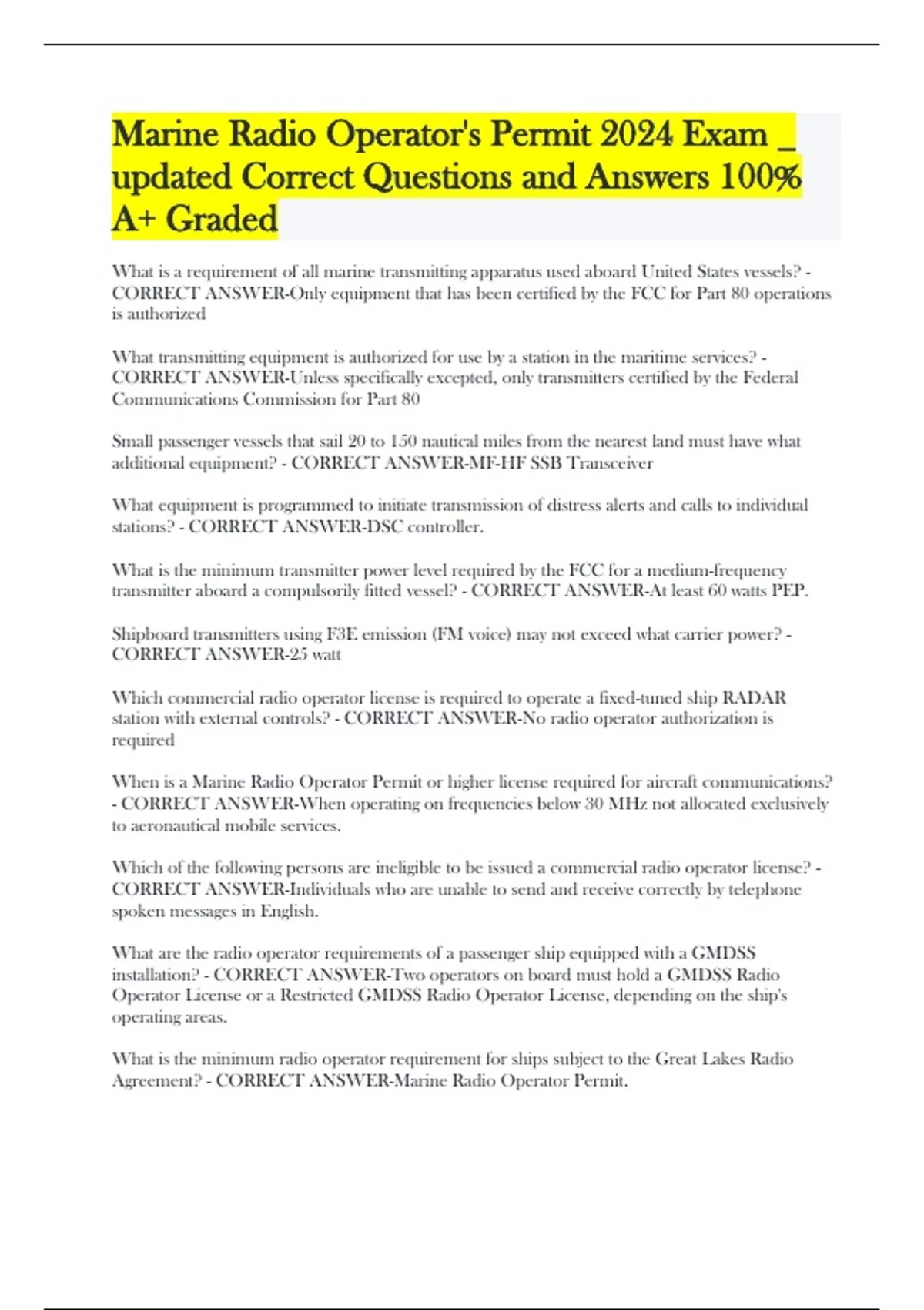 Marine Radio Operator's Permit 2024 Exam _ updated Correct Questions and Answers 100% A+ Graded