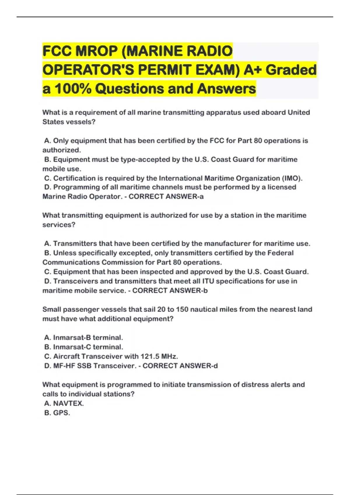 FCC MROP (MARINE RADIO OPERATOR'S PERMIT EXAM) A+ Graded a 100% Questions and Answers What is a requirement of all marine transmitting apparatus used aboard United States vessels? A. Only equipment that has been certified by the FCC for Part 80 operations is authorized. B. Equipment must be type-accepted by the U.S. Coast Guard for maritime mobile use. C. Certification is required by the International Maritime Organization (IMO). D. Programming of all maritime channels must be performed by a licensed Marine Radio Operator. - CORRECT ANSWER-a What transmitting equipment is authorized for use by a station in the maritime services? A. Transmitters that have been certified by the manufacturer for maritime use. B. Unless specifically excepted, only transmitters certified by the Federal Communications Commission for Part 80 operations. C. Equipment that has been inspected and approved by the U.S. Coast Guard. D. Transceivers and transmitters that meet all ITU specifications for use in maritime mobile service. - CORRECT ANSWER-b Small passenger vessels that sail 20 to 150 nautical miles from the nearest land must have what additional equipment? A. Inmarsat-B terminal. B. Inmarsat-C terminal. C. Aircraft Transceiver with 121.5 MHz. D. MF-HF SSB Transceiver. - CORRECT ANSWER-d What equipment is programmed to initiate transmission of distress alerts and calls to individual stations? A. NAVTEX. B. GPS. C. DSC controller. D. Scanning Watch Receiver. - CORRECT ANSWER-c What is the minimum transmitter power level required by the FCC for a medium-frequency transmitter aboard a compulsorily fitted vessel? A. At least 100 watts, single-sideband, suppressed-carrier power. B. At least 60 watts PEP. C. The power predictably needed to communicate with the nearest public coast station operating on 2182 kHz. D. At least 25 watts delivered into 50 ohms effective resistance when operated with a primary voltage of 13.6 volts DC. - CORRECT ANSWER-b Shipboard transmitters using F3E emission (FM voice) may not exceed what carrier power? A. 500 watts. B. 250 watts. C. 100 watts. D. 25 watts. - CORRECT ANSWER-d Which commercial radio operator license is required to operate a fixed-tuned ship RADAR station with external controls? A. A radio operator certificate containing a Ship RADAR Endorsement. B. A Marine Radio Operator Permit or higher. C. Either a First or Second Class Radiotelegraph certificate or a General Radiotelephone Operator License. D No radio operator authorization is required. - CORRECT ANSWER-d When is a Marine Radio Operator Permit or higher license required for aircraft communications? A. When operating on frequencies below 30 MHz allocated exclusively to aeronautical mobile services. B. When operating on frequencies above 30 MHz allocated exclusively to aeronautical mobile services. C. When operating on frequencies below 30 MHz not allocated exclusively to aeronautical mobile services. D. When operating on frequencies above 30 MHz not assigned for international use. - CORRECT ANSWER-c Which of the following persons are ineligible to be issued a commercial radio operator license? A. Individuals who are unable to send and receive correctly by telephone spoken messages in English. B. Handicapped persons with uncorrected disabilities which affect their ability to perform all duties required of commercial radio operators. C. Foreign maritime radio operators unless they are certified by the International Maritime Organization (IMO). D. U.S. Military radio operators who are still on active duty. - CORRECT ANSWER-a What are the radio operator requirements of a passenger ship equipped with a GMDSS installation? A. The operator must hold a General Radiotelephone Operator License or higher-class license. B. The operator must hold a Restricted Radiotelephone Operator Permit or higher-class license. C. The operator must hold a Marine Radio Operator Permit or higher-class license. D. Two operators on board must hold a GMDSS Radio Operator License or a Restricted GMDSS Radio Operator License, depending on the ship's operating areas. - CORRECT ANSWER-d What is the minimum radio operator requirement for ships subject to the Great Lakes Radio Agreement? A. Third Class Radiotelegraph Operator's Certificate. B. General Radiotelephone Operator License. C. Marine Radio Operator Permit. D. Restricted Radiotelephone Operator Permit. - CORRECT ANSWER-c What is a requirement of every commercial operator on duty and in charge of a transmitting system?