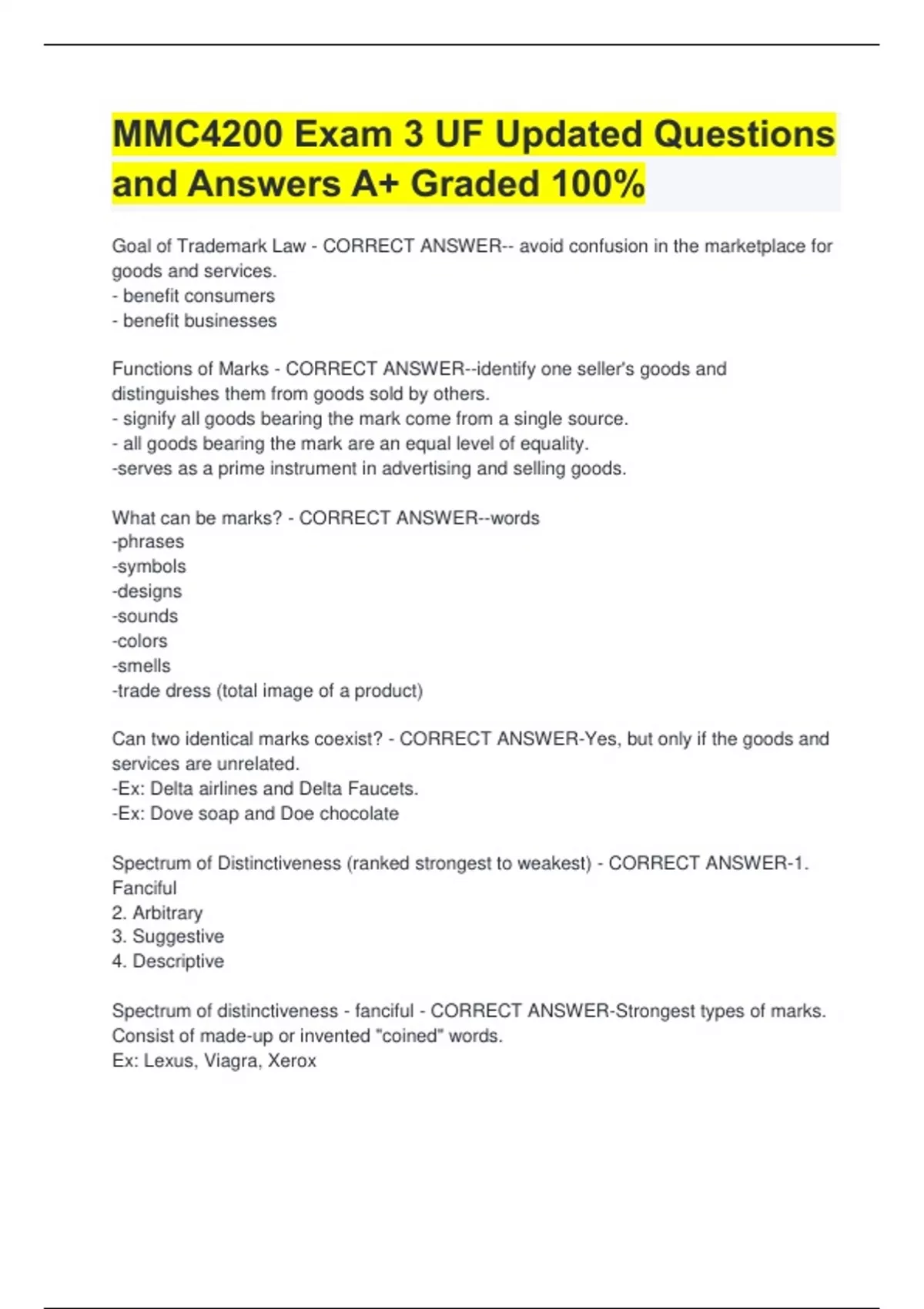 MMC4200 Exam 3 UF Updated Questions and Answers A+ Graded 100% Goal of Trademark Law - CORRECT ANSWER-- avoid confusion in the marketplace for goods and services. - benefit consumers - benefit businesses Functions of Marks - CORRECT ANSWER--identify one seller's goods and distinguishes them from goods sold by others. - signify all goods bearing the mark come from a single source. - all goods bearing the mark are an equal level of equality. -serves as a prime instrument in advertising and selling goods. What can be marks? - CORRECT ANSWER--words -phrases -symbols -designs -sounds -colors -smells -trade dress (total image of a product) Can two identical marks coexist? - CORRECT ANSWER-Yes, but only if the goods and services are unrelated. -Ex: Delta airlines and Delta Faucets. -Ex: Dove soap and Doe chocolate Spectrum of Distinctiveness (ranked strongest to weakest) - CORRECT ANSWER-1. Fanciful 2. Arbitrary 3. Suggestive 4. Descriptive Spectrum of distinctiveness - fanciful - CORRECT ANSWER-Strongest types of marks. Consist of made-up or invented "coined" words. Ex: Lexus, Viagra, Xerox Spectrum of distinctiveness - arbitrary - CORRECT ANSWER-Second strongest type of mark. An existing word is used as a mark that for a good/service that is unrelated to the usual meaning of the word Ex: Apple(computers), Camel(cigarettes) Spectrum of distinctiveness - suggestive - CORRECT ANSWER-Weaker than fanciful and arbitrary marks. Suggests some attributes about the product but does not clearly describe it. Ex: Coppertone is a suggestive mark for a suntan lotion, implying the shade of skin one achieves using it. Spectrum of Distinctiveness - descriptive - CORRECT ANSWER-Weakest type of mark. Describes features or quality of product wihtout a consumer having to do any thinking. Ex: Arm & Hammer makes daily shower spray to prevent mold called "clean show" -Requires company to demonstrate that the mark has obtained secondary meaning. Secondary meaning - CORRECT ANSWER-a legal term signifying the words in question have taken on a new meaning with the public, capable of serving a source-identifying function of a mark
