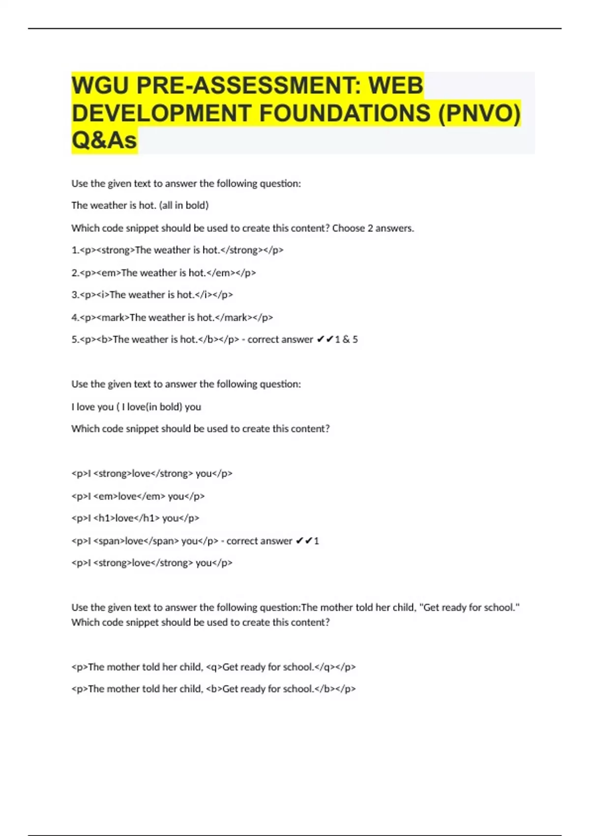 WGU PRE-ASSESSMENT: WEB DEVELOPMENT FOUNDATIONS (PNVO) Q&As Use the given text to answer the following question: The weather is hot. (all in bold) Which code snippet should be used to create this content? Choose 2 answers. 1.<p><strong>The weather is hot.</strong></p> 2.<p><em>The weather is hot.</em></p> 3.<p><i>The weather is hot.</i></p> 4.<p><mark>The weather is hot.</mark></p> 5.<p><b>The weather is hot.</b></p> - correct answer 1 & 5 Use the given text to answer the following question: I love you ( I love(in bold) you Which code snippet should be used to create this content? <p>I <strong>love</strong> you</p> <p>I <em>love</em> you</p> <p>I <h1>love</h1> you</p> <p>I <span>love</span> you</p> - correct answer 1 <p>I <strong>love</strong> you</p> Use the given text to answer the following question:The mother told her child, "Get ready for school." W