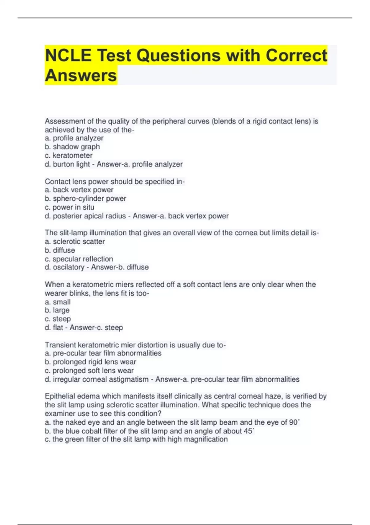 NCLE Test Questions with Correct Answers Assessment of the quality of the peripheral curves (blends of a rigid contact lens) is achieved by the use of thea. profile analyzer b. shadow graph c. keratometer d. burton light - Answer-a. profile analyzer Contact lens power should be specified ina. back vertex power b. sphero-cylinder power c. power in situ d. posterier apical radius - Answer-a. back vertex power The slit-lamp illumination that gives an overall view of the cornea but limits detail isa. sclerotic scatter b. diffuse c. specular reflection d. oscilatory - Answer-b. diffuse When a keratometric miers reflected off a soft contact lens are only clear when the wearer blinks, the lens fit is tooa. small b. large c. steep d. flat - Answer-c. steep Transient keratometric mier distortion is usually due toa. pre-ocular tear film abnormalities b. prolonged rigid lens wear c. prolonged soft lens wear d. irregular corneal astigmatism - Answer-a. pre-ocular tear film abnormalities Epithelial edema which manifests itself clinically as central corneal haze, is verified by the slit lamp using sclerotic scatter illumination. What specific technique does the examiner use to see this condition? a. the naked eye and an angle between the slit lamp beam and the eye of 90˚ b. the blue cobalt filter of the slit lamp and an angle of about 45˚ c. the green filter of the slit lamp with high magnification d. high magnification and an angle between the beam and scope of 180˚ - Answer-a. the naked eye and an angle between the slit lamp beam and the eye of 90˚ With a rigid contact lens in place a flourescein pattern shows a narrow bend horizontally wih a concentration of flourescein inferiorly and superiorly under the lens. Which one of the following type of astigmatism is represented by this pattern? a. lenticular astigmatism b. residual astigmatism c. against the rule astigmatism d. with the rule astigmatism - Answer-d. with the rule astigmatism Refractive Rx -3.00 -1.00 x 170 K's 42.00 @ 170/43.00 @ 80 Given the above Rx and K's he following diagnostic toric soft lens was used: B.C. 8.8 Power -3.00 -1.00 x 180 During dianostic evalutation, the above lens rotated 10 clockwise. The lens ordered should have an axis of: a. 10 b. 180 c. 170 d. 160 - Answer-b. 180 Given the same circumstances from the above question, once the correctly ordered lens has been dispensed, the rotational marks should settle at _______. a. 6 o clock b. 10 clockwise rotation c. 10 counter clockwise rotation d. none of the above - Answer-b. 10 clockwise rotation