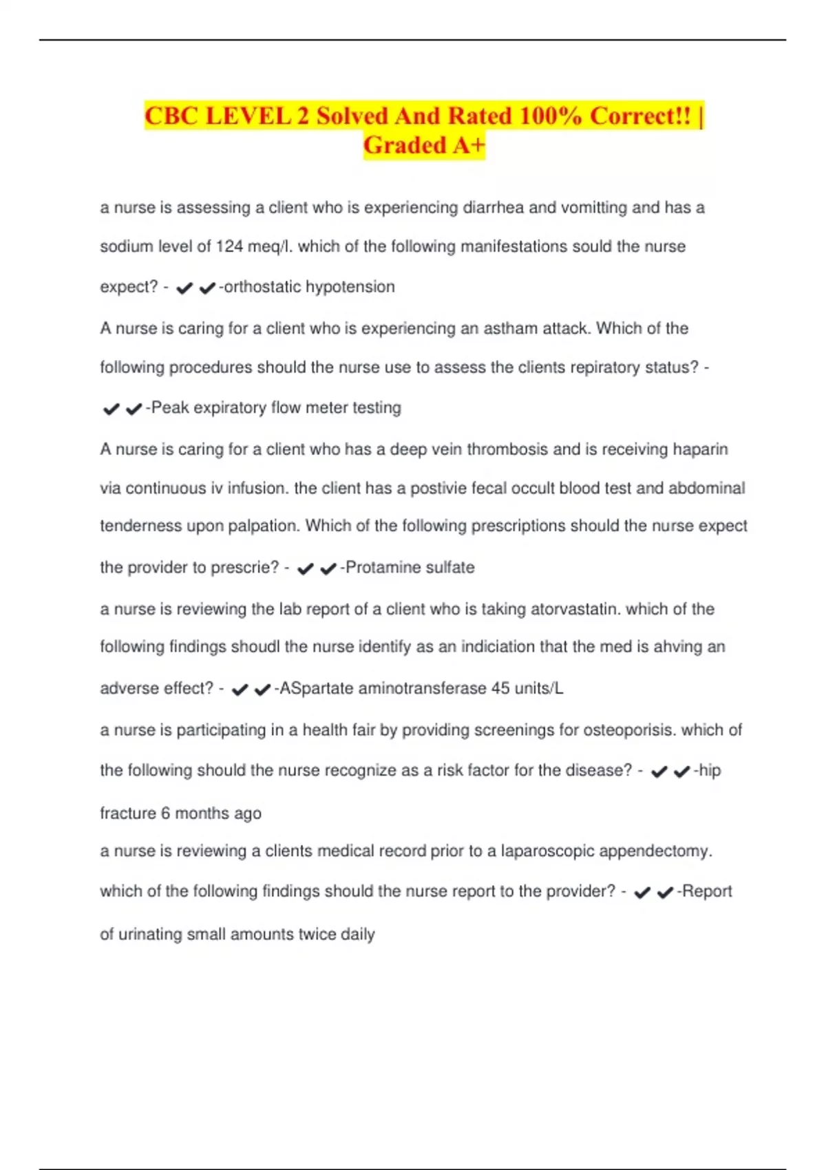 CBC LEVEL 2 Solved And Rated 100% Correct!! | Graded A+ a nurse is assessing a client who is experiencing diarrhea and vomitting and has a sodium level of 124 meq/l. which of the following manifestations sould the nurse expect? - ️️ -orthostatic hypotension A nurse is caring for a client who is experiencing an astham attack. Which of the following procedures should the nurse use to assess the clients repiratory status? - ️️ -Peak expiratory flow meter testing A nurse is caring for a client who has a deep vein thrombosis and is receiving haparin via continuous iv infusion. the client has a postivie fecal occult blood test and abdominal tenderness upon palpation. Which of the following prescriptions should the nurse expect the provider to prescrie? - ️️ -Protamine sulfate a nurse is reviewing the lab report of a client who is taking atorvastatin. which of the following findings shoudl the nurse identify as an indiciation that the med is ahving an adverse effect? - ️️ -ASpartate aminotransferase 45 units/L a nurse is participating in a health fair by providing screenings for osteoporisis. which of the following should the nurse recognize as a risk factor for the disease? - ️️ -hip fracture 6 months ago a nurse is reviewing a clients medical record prior to a laparoscopic appendectomy. which of the following findings should the nurse report to the provider? - ️️ -Report of urinating small amounts twice daily a nurse in an emergency department is reviewing the lab report of a client who ahs hyperventilation. The client's ABG results are ph 7.5, PaCo2 29, and hco3 25 meq/l. the nurse should interpret that these values are an indication of whic of the following acid base imbalances? - ️️ -respiratory alkalosis a nurse is reviewing the lab results of an adult client who has metabolic alkalosis. Which of the following findings should the nurse expect? - ️️ -potassium 3 meq/l A nurse is assessing a client for manifestations of right sided heart failure. Which of the following findings shoudl the nurse expect? - ️️ -jugular vein distention a nurse is providing teachign about home care to the paretn of a child who has pediculosis capitis. which of the following information shoul the nurse include? - ️️ - comb the childs hair daily with an extra fine tooth comb a nurse is assessing a client who has generalized anxiety disorder and has been practicing adaptive use of coping mechanisms. which of the following repsonses indicates the clients adaptive use of suppression? - ️️ -I avoid thinking about problems that worry me until i have time to focus on a solution a nurse in an emergency department is caring for a client who has appendicitis. which of the following actions should the nurse take? - ️️ -place client in semi fowlers position a nurse is assessing a client who has developed c diff as an adverse effect to ciprofloxacin. which of the following medications should the nurse expect the provider to prescribe to treat c diff. - ️️ -vancomycin a nurse is providing dietary teaching for a client who has GERD. the nurse should instruct the client to avoid which items? - ️️ -caffeinated coffee a nurse is caring for a client who has possible appendicits. which of the following actions should the nurse take? - ️️ -start iv fluid replacement a nurse is assessing newly admitted client who has an intense fear of heights. which of the following clincial names for this fear shuld the nurse document in the clients medical record? - ️️ -acrophobia a nurse is reviewing lab results of an adult male client who has hyperlipidemia and is making lifestyle changes to improve his choelsterol levels. which fo the following findings indicates to the nurse that the client ahs achieved therapeutic repsonse. - ️️ -hdl 50 mg/dl a nurse is planning discharge for a postpartum client. the client tells the nurse she is having a subdermal implant placed for contraception at her 6 week follow up exam and asks about the adverse effects of the implant. which of the following manifestations should the nurse include? - ️️ -irregular bleeding a nurse is providing teaching about home care to the parent of an adolescent who has infectious mononucleosis. which of the following manifestations should the nurse instruct the parent to report to the provider? - ️️ -onset of abdominal pain a nurse is assessing a client who has a new diagnosis of hypothyroidism. which of the following mani should the nurse expect? - ️️ -cold intolerance a nurse is assessing a client who has dvt in the right lower extremity. which of the following findings on the