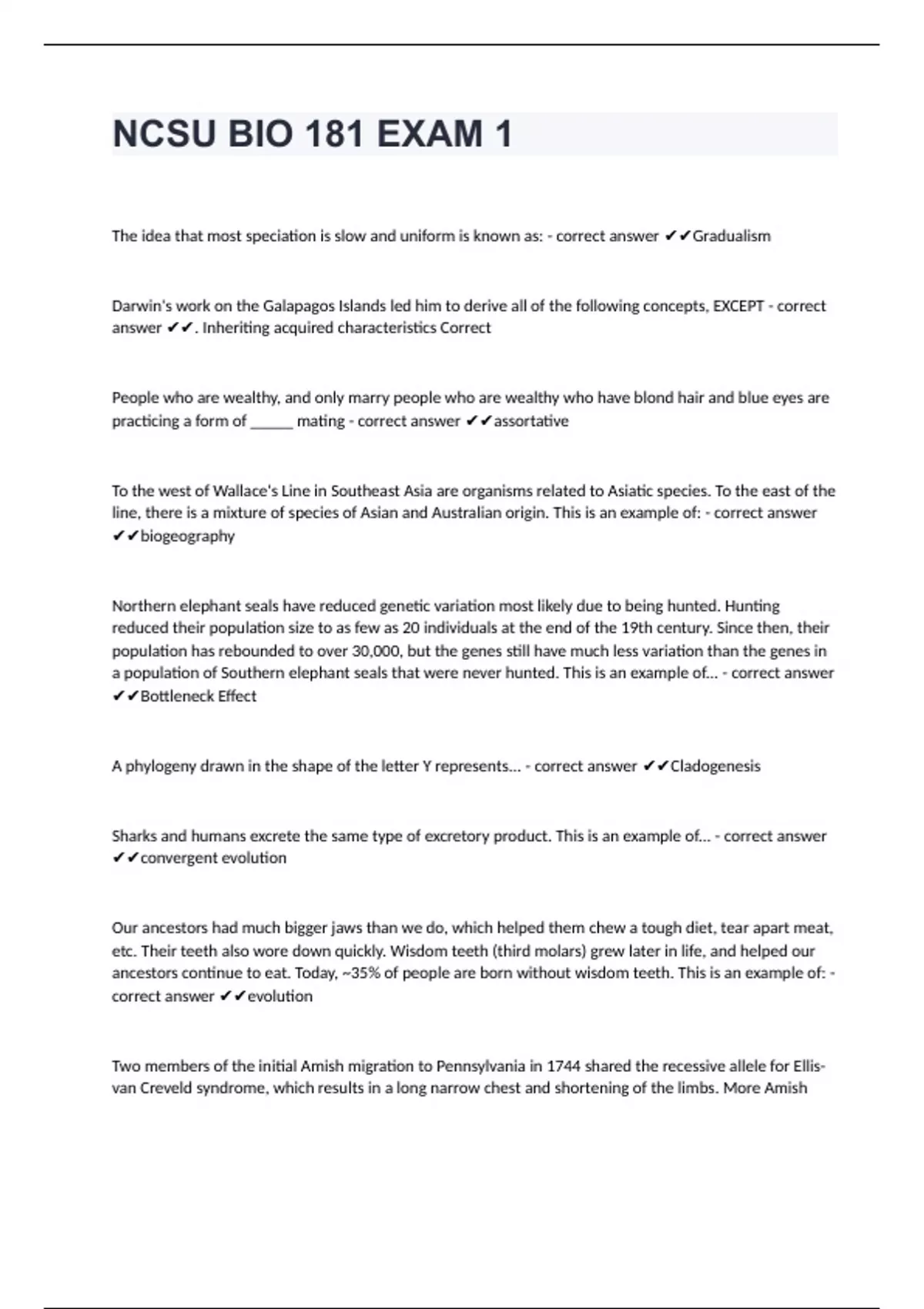 NCSU BIO 181 EXAM 1The idea that most speciation is slow and uniform is known as: - correct answer Gradualism Darwin's work on the Galapagos Islands led him to derive all of the following concepts, EXCEPT - correct answer . Inheriting acquired characteristics Correct People who are wealthy, and only marry people who are wealthy who have blond hair and blue eyes are practicing a form of _____ mating - correct answer assortative To the west of Wallace's Line in Southeast Asia are organisms related to Asiatic species. To the east of the line, there is a mixture of species of Asian and Australian origin. This is an example of: - correct answer biogeography Northern elephant seals have reduced genetic variation most likely due to being hunted. Hunting reduced their population size to as few as 20 individuals at the end of the 19th century. Since then, their population has rebounded to over 30,000, but the genes still have much less variation than the genes in a population of Southern elephant seals that were never hunted. This is an example of... - correct answer Bottleneck Effect A phylogeny drawn in the shape of the letter Y represents... - correct answer Cladogenesis Sharks and humans excrete the same type of excretory product. This is an example of... - correct answer convergent evolution Our ancestors had much bigger jaws than we do, which helped them chew a tough diet, tear apart meat, etc. Their teeth also wore down quickly. Wisdom teeth (third molars) grew later in life, and helped our ancestors continue to eat. Today, ~35% of people are born without wisdom teeth. This is an example of: - correct answer evolution Two members of the initial Amish migration to Pennsylvania in 1744 shared the recessive allele for Ellis-van Creveld syndrome, which results in a long narrow chest and shortening of the limbs. More Amish