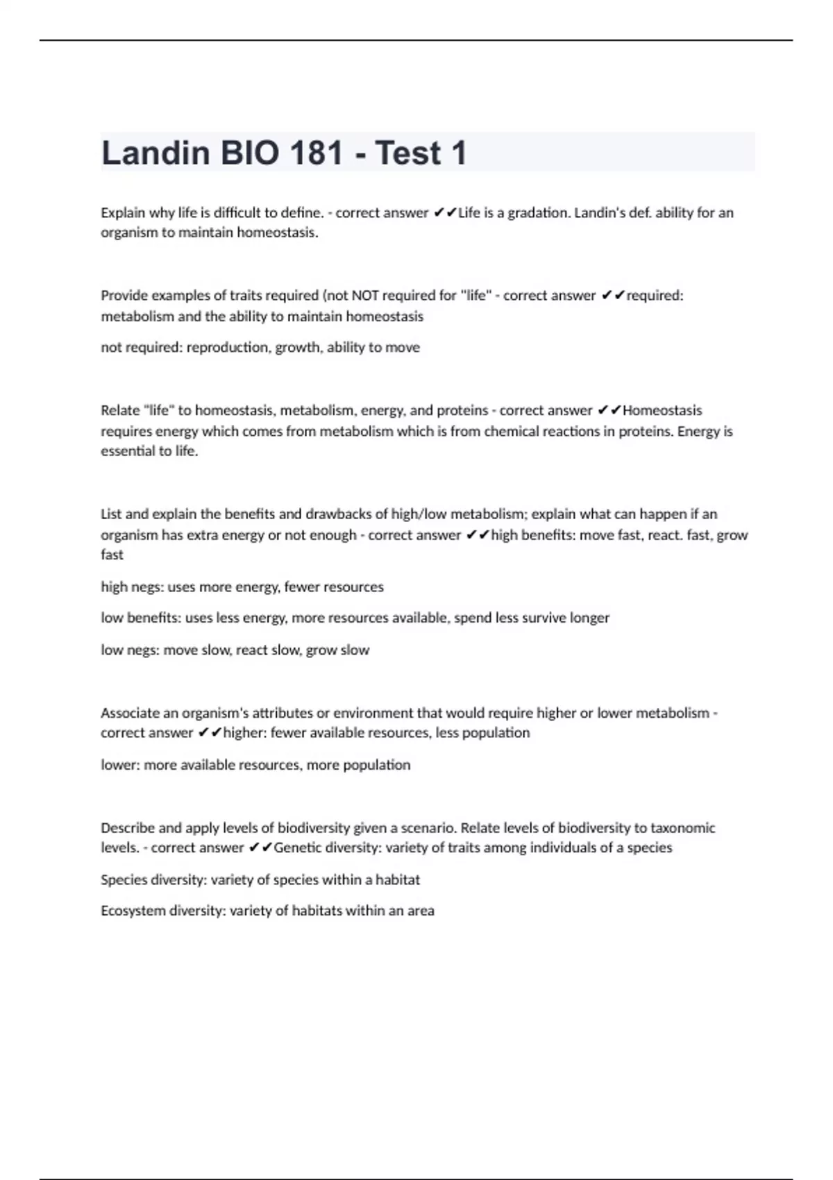 Landin BIO 181 - Test 1Explain why life is difficult to define. - correct answer Life is a gradation. Landin's def. ability for an organism to maintain homeostasis. Provide examples of traits required (not NOT required for "life" - correct answer required: metabolism and the ability to maintain homeostasis not required: reproduction, growth, ability to move Relate "life" to homeostasis, metabolism, energy, and proteins - correct answer Homeostasis requires energy which comes from metabolism which is from chemical reactions in proteins. Energy is essential to life. List and explain the benefits and drawbacks of high/low metabolism; explain what can happen if an organism has extra energy or not enough - correct answer high benefits: move fast, react. fast, grow fast high negs: uses more energy, fewer resources low benefits: uses less energy, more resources available, spend less survive longer low negs: move slow, react slow, grow slow