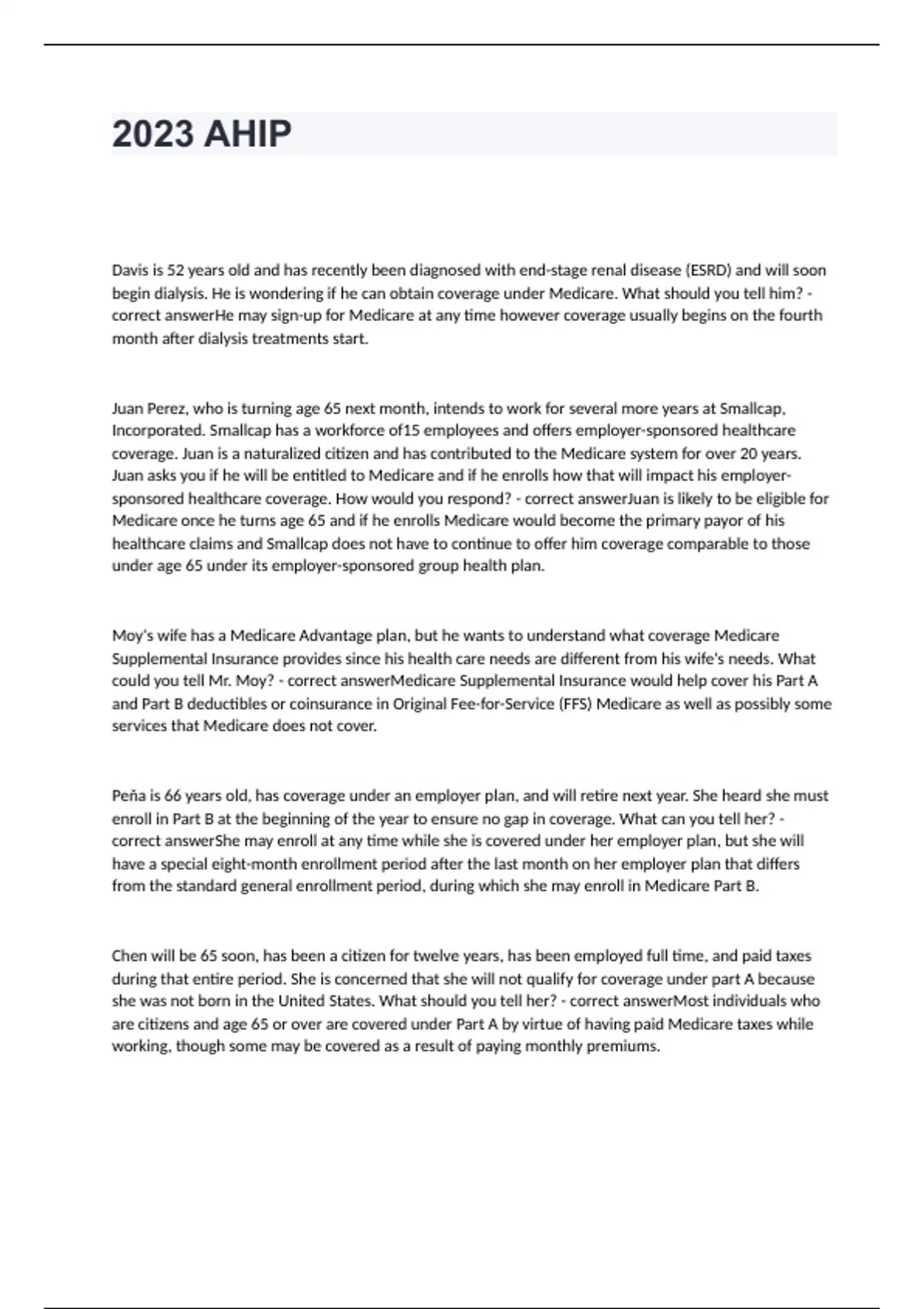 Davis is 52 years old and has recently been diagnosed with end-stage renal disease (ESRD) and will soon begin dialysis. He is wondering if he can obtain coverage under Medicare. What should you tell him? - correct answerHe may sign-up for Medicare at any time however coverage usually begins on the fourth month after dialysis treatments start. Juan Perez, who is turning age 65 next month, intends to work for several more years at Smallcap, Incorporated. Smallcap has a workforce of15 employees and offers employer-sponsored healthcare coverage. Juan is a naturalized citizen and has contributed to the Medicare system for over 20 years. Juan asks you if he will be entitled to Medicare and if he enrolls how that will impact his employer-sponsored healthcare coverage. How would you respond? - correct answerJuan is likely to be eligible for Medicare once he turns age 65 and if he enrolls Medicare would become the primary payor of his healthcare claims and Smallcap does not have to continue to offer him coverage comparable to those under age 65 under its employer-sponsored group health plan. Moy's wife has a Medicare Advantage plan, but he wants to understand what coverage Medicare Supplemental Insurance provides since his health care needs are different from his wife's needs. What could you tell Mr. Moy? - correct answerMedicare Supplemental Insurance would help cover his Part A and Part B deductibles or coinsurance in Original Fee-for-Service (FFS) Medicare as well as possibly some services that Medicare does not cover. Peňa is 66 years old, has coverage under an employer plan, and will retire next year. She heard she must enroll in Part B at the beginning of the year to ensure no gap in coverage. What can you tell her? - correct answerShe may enroll at any time while she is covered under her employer plan, but she will have a special eight-month enrollment period after the last month on her employer plan that differs from the standard general enrollment period, during which she may enroll in Medicare Part B. Chen will be 65 soon, has been a citizen for twelve years, has been employed full time, and paid taxes during that entire period. She is concerned that she will not qualify for coverage under part A because she was not born in the United States. What should you tell her? - correct answerMost individuals who are citizens and age 65 or over are covered under Part A by virtue of having paid Medicare taxes while working, though some may be covered as a result of paying monthly premiums.