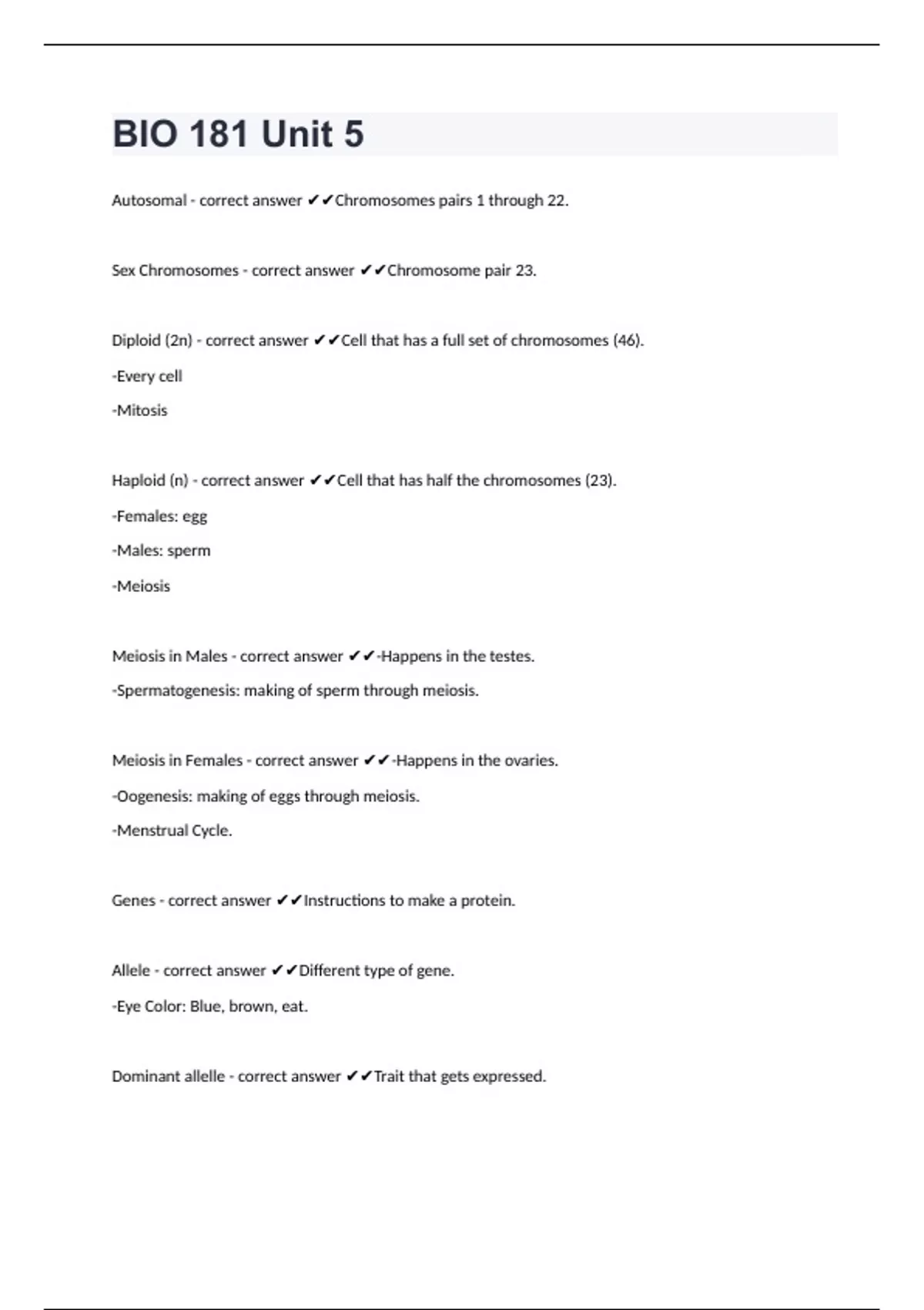 BIO 181 Unit 5Autosomal - correct answer Chromosomes pairs 1 through 22. Sex Chromosomes - correct answer Chromosome pair 23. Diploid (2n) - correct answer Cell that has a full set of chromosomes (46). -Every cell -Mitosis Haploid (n) - correct answer Cell that has half the chromosomes (23). -Females: egg -Males: sperm -Meiosis Meiosis in Males - correct answer -Happens in the testes. -Spermatogenesis: making of sperm through meiosis. Meiosis in Females - correct answer -Happens in the ovaries. -Oogenesis: making of eggs through meiosis. -Menstrual Cycle. Genes - correct answer Instructions to make a protein. Allele - correct answer Different type of gene. -Eye Color: Blue, brown, eat. Dominant allelle - correct answer Trait that gets expressed.