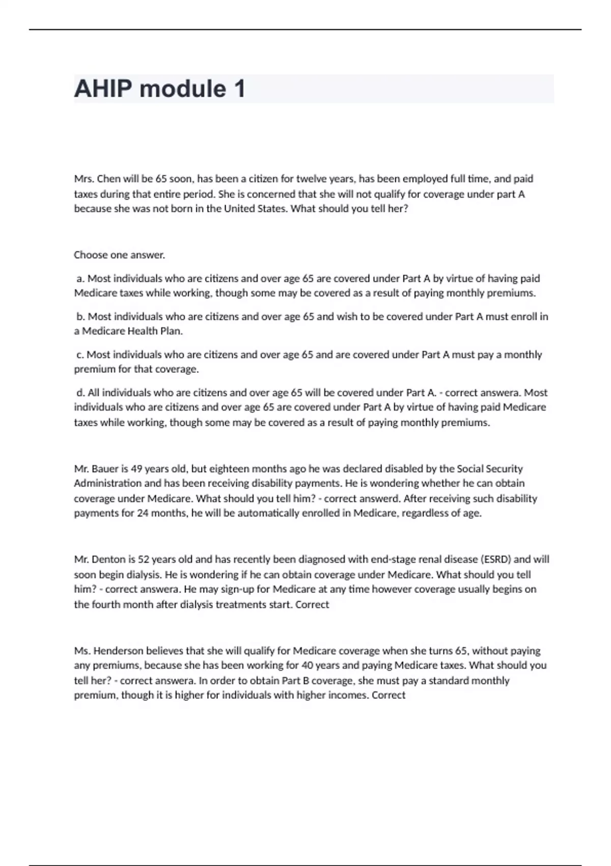 Mrs. Chen will be 65 soon, has been a citizen for twelve years, has been employed full time, and paid taxes during that entire period. She is concerned that she will not qualify for coverage under part A because she was not born in the United States. What should you tell her? Choose one answer. a. Most individuals who are citizens and over age 65 are covered under Part A by virtue of having paid Medicare taxes while working, though some may be covered as a result of paying monthly premiums. b. Most individuals who are citizens and over age 65 and wish to be covered under Part A must enroll in a Medicare Health Plan. c. Most individuals who are citizens and over age 65 and are covered under Part A must pay a monthly premium for that coverage. d. All individuals who are citizens and over age 65 will be covered under Part A. - correct answera. Most individuals who are citizens and over age 65 are covered under Part A by virtue of having paid Medicare taxes while working, though some may be covered as a result of paying monthly premiums. Mr. Bauer is 49 years old, but eighteen months ago he was declared disabled by the Social Security Administration and has been receiving disability payments. He is wondering whether he can obtain coverage under Medicare. What should you tell him? - correct answerd. After receiving such disability payments for 24 months, he will be automatically enrolled in Medicare, regardless of age. Mr. Denton is 52 years old and has recently been diagnosed with end-stage renal disease (ESRD) and will soon begin dialysis. He is wondering if he can obtain coverage under Medicare. What should you tell him? - correct answera. He may sign-up for Medicare at any time however coverage usually begins on the fourth month after dialysis treatments start. Correct Ms. Henderson believes that she will qualify for Medicare coverage when she turns 65, without paying any premiums, because she has been working for 40 years and paying Medicare taxes. What should you tell her? - correct answera. In order to obtain Part B coverage, she must pay a standard monthly premium, though it is higher for individuals with higher incomes. Correct