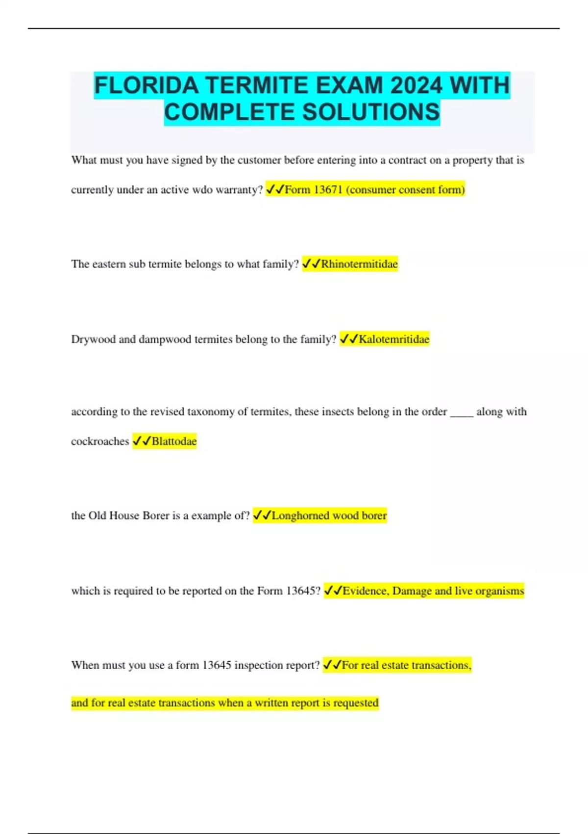 What must you have signed by the customer before entering into a contract on a property that is currently under an active wdo warranty? Form 13671 (consumer consent form) The eastern sub termite belongs to what family? Rhinotermitidae Drywood and dampwood termites belong to the family? Kalotemritidae according to the revised taxonomy of termites, these insects belong in the order ____ along with cockroaches Blattodae the Old House Borer is a example of? Longhorned wood borer which is required to be reported on the Form 13645? Evidence, Damage and live organisms When must you use a form 13645 inspection report? For real estate transactions, and for real estate transactions when a written report is requestedwhich is the minimum amount of errors on omissions liability insurance? $500,000/$250,00 which are the two documents that can give you guidance on completing a form 13645 inspection report? The industry baseline practices and the guidelines for the use and completion of the form 13645