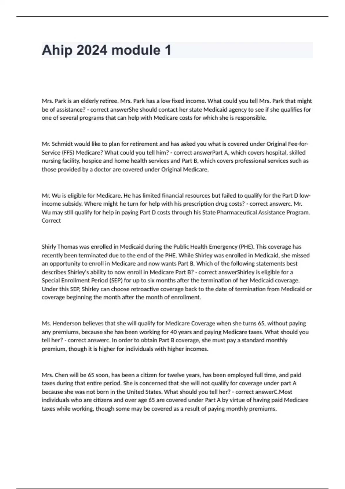 Mrs. Park is an elderly retiree. Mrs. Park has a low fixed income. What could you tell Mrs. Park that might be of assistance? - correct answerShe should contact her state Medicaid agency to see if she qualifies for one of several programs that can help with Medicare costs for which she is responsible. Mr. Schmidt would like to plan for retirement and has asked you what is covered under Original Fee-for-Service (FFS) Medicare? What could you tell him? - correct answerPart A, which covers hospital, skilled nursing facility, hospice and home health services and Part B, which covers professional services such as those provided by a doctor are covered under Original Medicare. Mr. Wu is eligible for Medicare. He has limited financial resources but failed to qualify for the Part D low-income subsidy. Where might he turn for help with his prescription drug costs? - correct answerc. Mr. Wu may still qualify for help in paying Part D costs through his State Pharmaceutical Assistance Program. Correct Shirly Thomas was enrolled in Medicaid during the Public Health Emergency (PHE). This coverage has recently been terminated due to the end of the PHE. While Shirley was enrolled in Medicaid, she missed an opportunity to enroll in Medicare and now wants Part B. Which of the following statements best describes Shirley's ability to now enroll in Medicare Part B? - correct answerShirley is eligible for a Special Enrollment Period (SEP) for up to six months after the termination of her Medicaid coverage. Under this SEP, Shirley can choose retroactive coverage back to the date of termination from Medicaid or coverage beginning the month after the month of enrollment. Ms. Henderson believes that she will qualify for Medicare Coverage when she turns 65, without paying any premiums, because she has been working for 40 years and paying Medicare taxes. What should you tell her? - correct answerc. In order to obtain Part B coverage, she must pay a standard monthly premium, though it is higher for individuals with higher incomes. Mrs. Chen will be 65 soon, has been a citizen for twelve years, has been employed full time, and paid taxes during that entire period. She is concerned that she will not qualify for coverage under part A because she was not born in the United States. What should you tell her? - correct answerC.Most individuals who are citizens and over age 65 are covered under Part A by virtue of having paid Medicare taxes while working, though some may be covered as a result of paying monthly premiums.