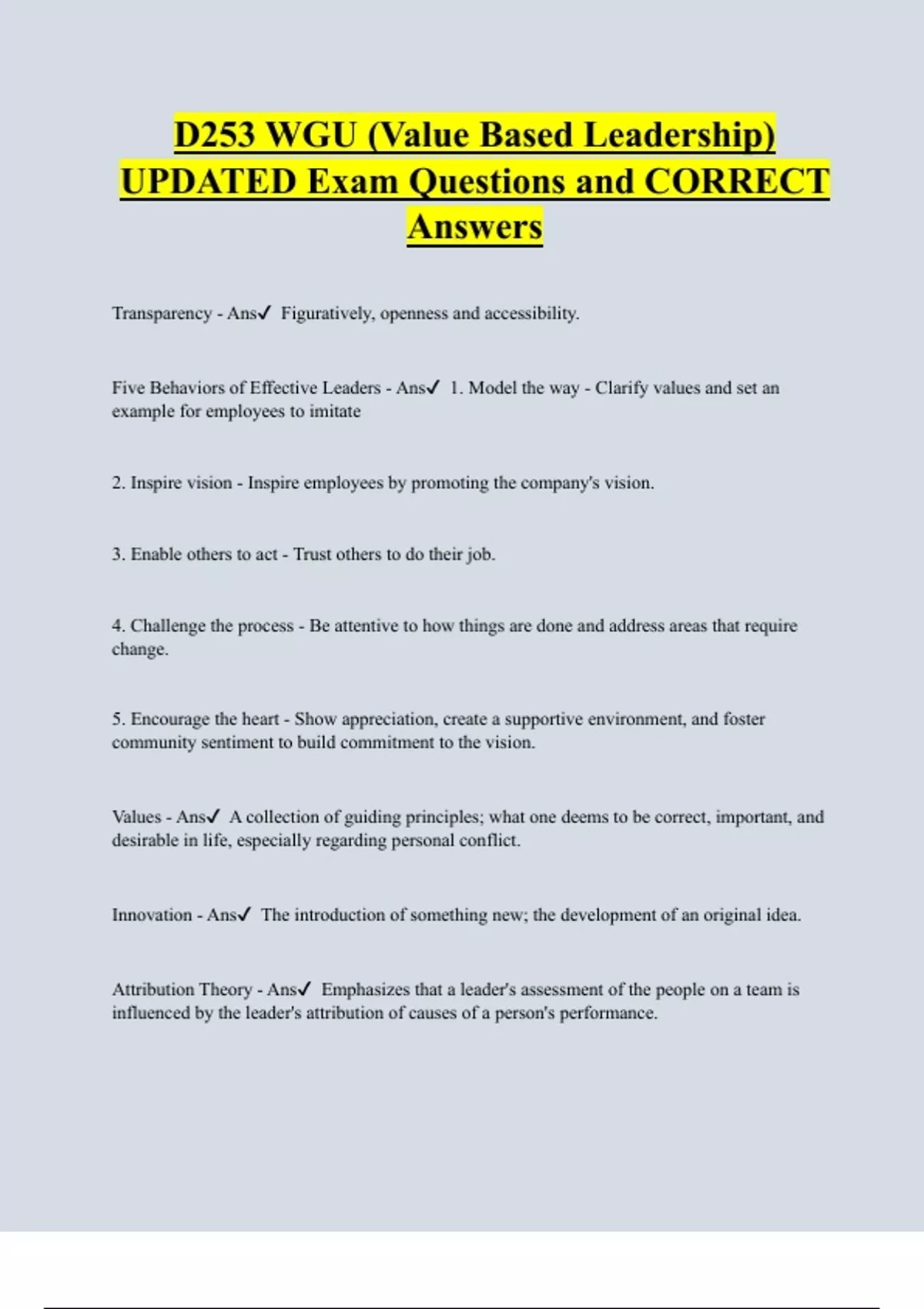 D253 WGU (Value Based Leadership) UPDATED Exam Questions and CORRECT Answers Transparency - Ans Figuratively, openness and accessibility. Five Behaviors of Effective Leaders - Ans 1. Model the way - Clarify values and set an example for employees to imitate 2. Inspire vision - Inspire employees by promoting the company's vision. 3. Enable others to act - Trust others to do their job.