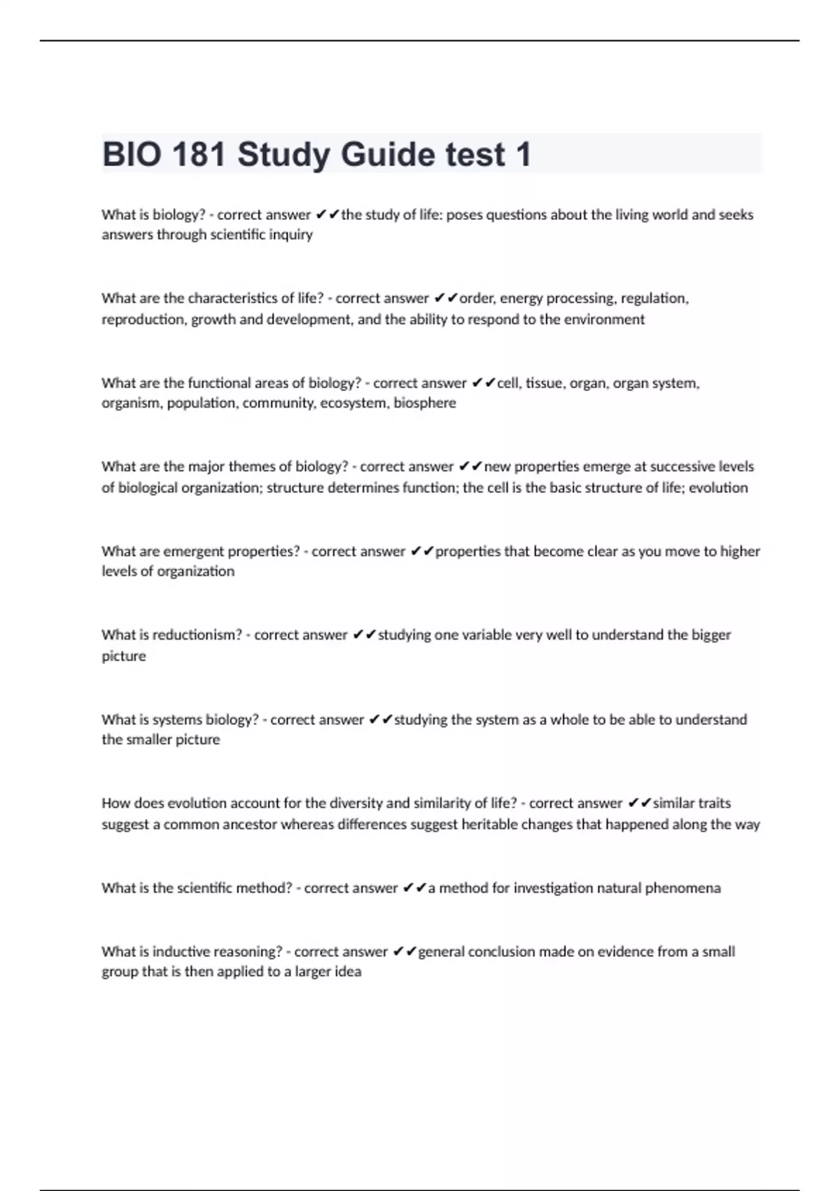 BIO 181 Study Guide test 1What is biology? - correct answer the study of life: poses questions about the living world and seeks answers through scientific inquiry What are the characteristics of life? - correct answer order, energy processing, regulation, reproduction, growth and development, and the ability to respond to the environment What are the functional areas of biology? - correct answer cell, tissue, organ, organ system, organism, population, community, ecosystem, biosphere What are the major themes of biology? - correct answer new properties emerge at successive levels of biological organization; structure determines function; the cell is the basic structure of life; evolution What are emergent properties? - correct answer properties that become clear as you move to higher levels of organization What is reductionism? - correct answer studying one variable very well to understand the bigger picture What is systems biology? - correct answer studying the system as a whole to be able to understand the smaller picture How does evolution account for the diversity and similarity of life? - correct answer similar traits suggest a common ancestor whereas differences suggest heritable changes that happened along the way What is the scientific method? - correct answer a method for investigation natural phenomena What is inductive reasoning? - correct answer general conclusion made on evidence from a small group that is then applied to a larger idea
