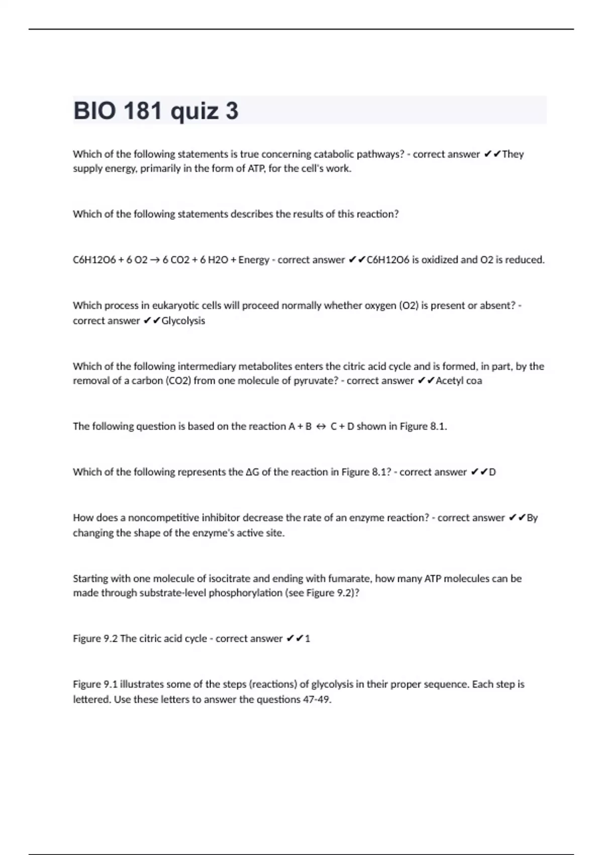 BIO 181 quiz 3Which of the following statements is true concerning catabolic pathways? - correct answer They supply energy, primarily in the form of ATP, for the cell's work. Which of the following statements describes the results of this reaction? C6H12O6 + 6 O2 → 6 CO2 + 6 H2O + Energy - correct answer C6H12O6 is oxidized and O2 is reduced. Which process in eukaryotic cells will proceed normally whether oxygen (O2) is present or absent? - correct answer Glycolysis Which of the following intermediary metabolites enters the citric acid cycle and is formed, in part, by the removal of a carbon (CO2) from one molecule of pyruvate? - correct answer Acetyl coa The following question is based on the reaction A + B ↔ C + D shown in Figure 8.1. Which of the following represents the ΔG of the reaction in Figure 8.1? - correct answer D How does a noncompetitive inhibitor decrease the rate of an enzyme reaction? - correct answer By changing the shape of the enzyme's active site. Starting with one molecule of isocitrate and ending with fumarate, how many ATP molecules can be made through substrate-level phosphorylation (see Figure 9.2)? Figure 9.2 The citric acid cycle - correct answer 1 Figure 9.1 illustrates some of the steps (reactions) of glycolysis in their proper sequence. Each step is lettered. Use these letters to answer the questions 47-49.
