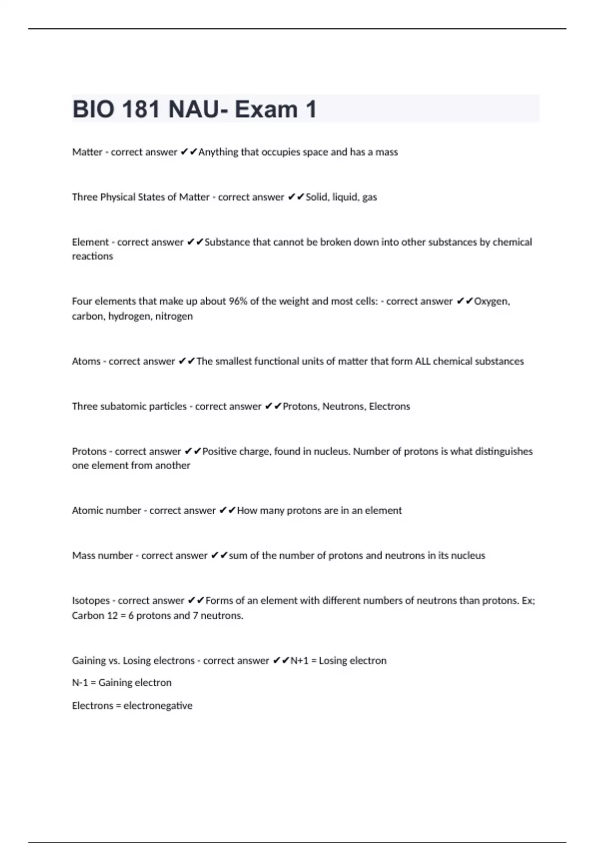 BIO 181 NAU- Exam 1Matter - correct answer Anything that occupies space and has a mass Three Physical States of Matter - correct answer Solid, liquid, gas Element - correct answer Substance that cannot be broken down into other substances by chemical reactions Four elements that make up about 96% of the weight and most cells: - correct answer Oxygen, carbon, hydrogen, nitrogen Atoms - correct answer The smallest functional units of matter that form ALL chemical substances Three subatomic particles - correct answer Protons, Neutrons, Electrons Protons - correct answer Positive charge, found in nucleus. Number of protons is what distinguishes one element from another Atomic number - correct answer How many protons are in an element Mass number - correct answer sum of the number of protons and neutrons in its nucleus