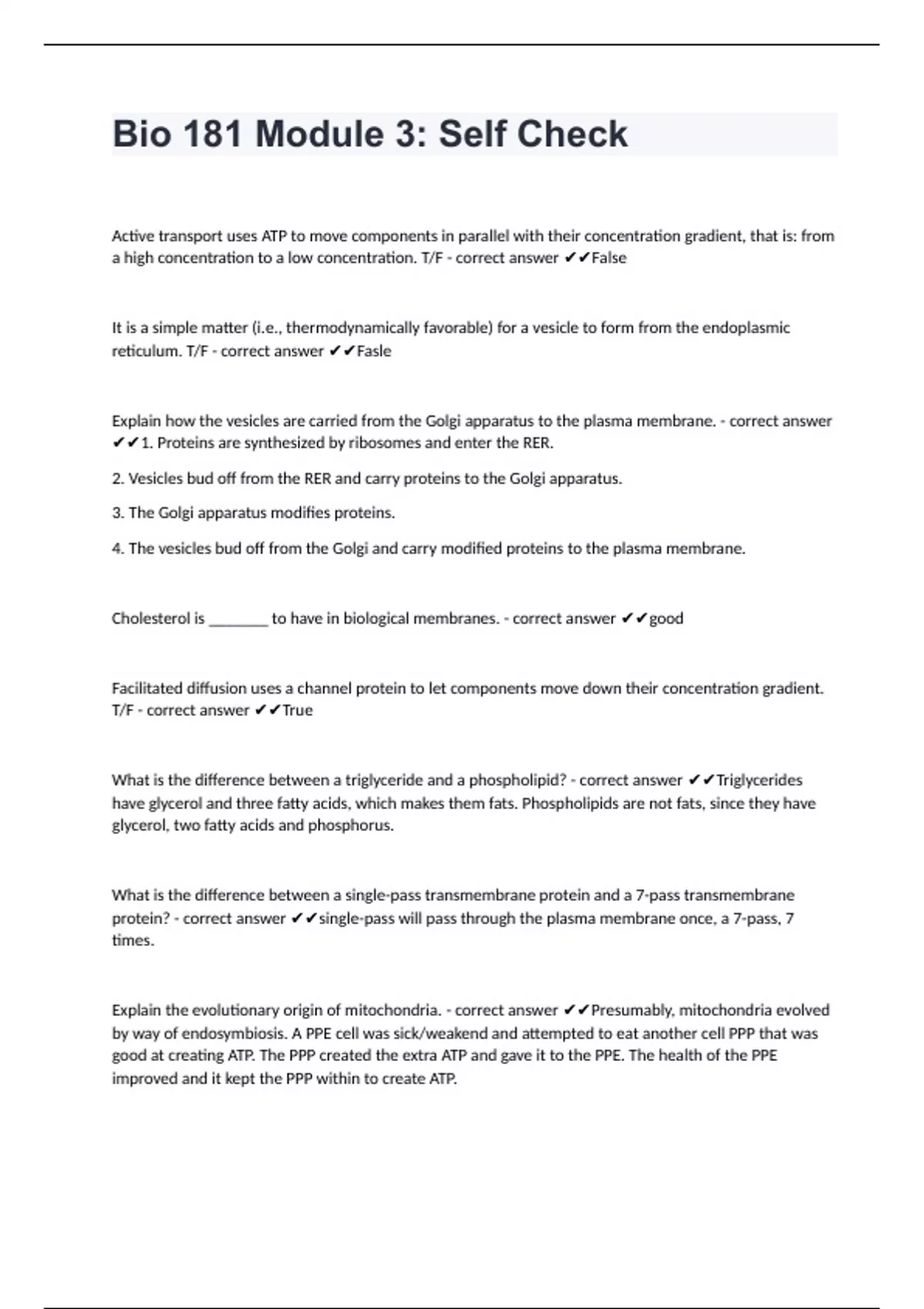 Bio 181 Module 3: Self CheckActive transport uses ATP to move components in parallel with their concentration gradient, that is: from a high concentration to a low concentration. T/F - correct answer False It is a simple matter (i.e., thermodynamically favorable) for a vesicle to form from the endoplasmic reticulum. T/F - correct answer Fasle Explain how the vesicles are carried from the Golgi apparatus to the plasma membrane. - correct answer 1. Proteins are synthesized by ribosomes and enter the RER. 2. Vesicles bud off from the RER and carry proteins to the Golgi apparatus. 3. The Golgi apparatus modifies proteins. 4. The vesicles bud off from the Golgi and carry modified proteins to the plasma membrane. Cholesterol is _______ to have in biological membranes. - correct answer good Facilitated diffusion uses a channel protein to let components move down their concentration gradient. T/F - correct answer True What is the difference between a triglyceride and a phospholipid? - correct answer Triglycerides have glycerol and three fatty acids, which makes them fats. Phospholipids are not fats, since they have glycerol, two fatty acids and phosphorus. What is the difference between a single-pass transmembrane protein and a 7-pass transmembrane protein? - correct answer single-pass will pass through the plasma membrane once, a 7-pass, 7 times. Explain the evolutionary origin of mitochondria. - correct answer Presumably, mitochondria evolved by way of endosymbiosis. A PPE cell was sick/weakend and attempted to eat another cell PPP that was good at creating ATP. The PPP created the extra ATP and gave it to the PPE. The health of the PPE improved and it kept the PPP within to create ATP.