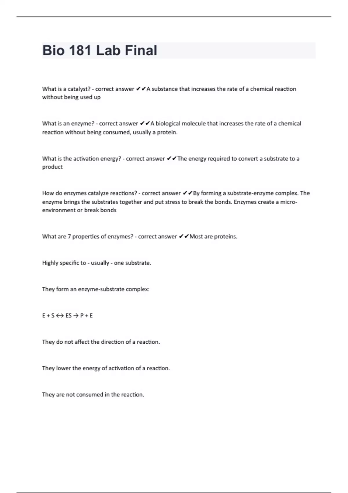 Bio 181 Lab FinalWhat is a catalyst? - correct answer A substance that increases the rate of a chemical reaction without being used up What is an enzyme? - correct answer A biological molecule that increases the rate of a chemical reaction without being consumed, usually a protein. What is the activation energy? - correct answer The energy required to convert a substrate to a product How do enzymes catalyze reactions? - correct answer By forming a substrate-enzyme complex. The enzyme brings the substrates together and put stress to break the bonds. Enzymes create a micro-environment or break bonds What are 7 properties of enzymes? - correct answer Most are proteins. Highly specific to - usually - one substrate. They form an enzyme-substrate complex: E + S ↔ ES → P + E They do not affect the direction of a reaction. They lower the energy of activation of a reaction. They are not consumed in the reaction.