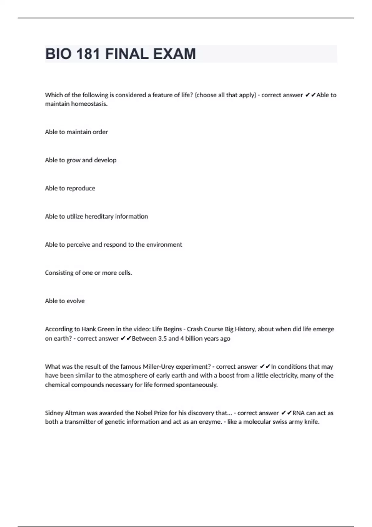 BIO 181 FINAL EXAMWhich of the following is considered a feature of life? (choose all that apply) - correct answer Able to maintain homeostasis. Able to maintain order Able to grow and develop Able to reproduce Able to utilize hereditary information Able to perceive and respond to the environment Consisting of one or more cells. Able to evolve According to Hank Green in the video: Life Begins - Crash Course Big History, about when did life emerge on earth? - correct answer Between 3.5 and 4 billion years ago What was the result of the famous Miller-Urey experiment? - correct answer In conditions that may have been similar to the atmosphere of early earth and with a boost from a little electricity, many of the chemical compounds necessary for life formed spontaneously. Sidney Altman was awarded the Nobel Prize for his discovery that... - correct answer RNA can act as both a transmitter of genetic information and act as an enzyme. - like a molecular swiss army knife.