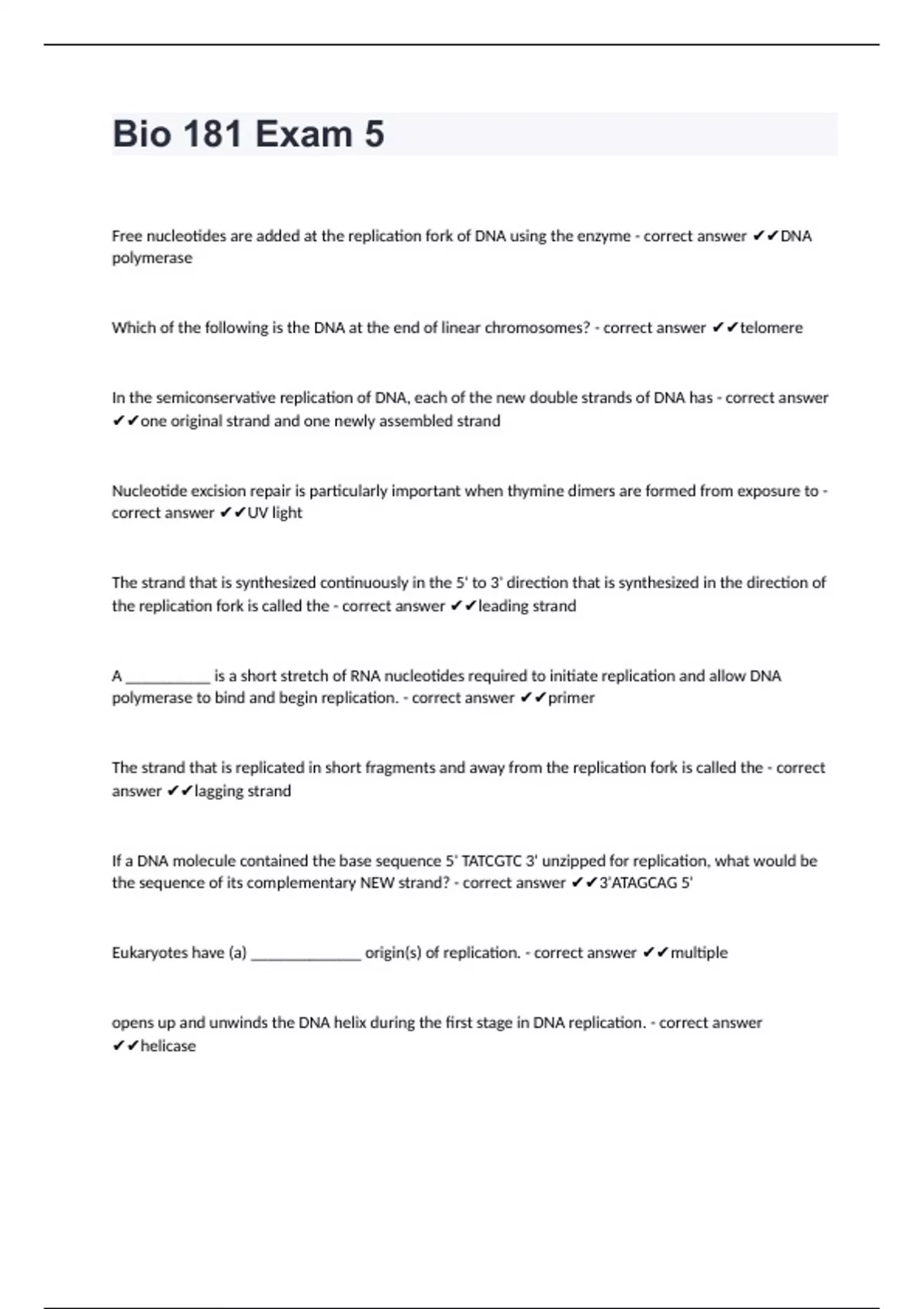 Bio 181 Exam 5Free nucleotides are added at the replication fork of DNA using the enzyme - correct answer DNA polymerase Which of the following is the DNA at the end of linear chromosomes? - correct answer telomere In the semiconservative replication of DNA, each of the new double strands of DNA has - correct answer one original strand and one newly assembled strand Nucleotide excision repair is particularly important when thymine dimers are formed from exposure to - correct answer UV light The strand that is synthesized continuously in the 5' to 3' direction that is synthesized in the direction of the replication fork is called the - correct answer leading strand A __________ is a short stretch of RNA nucleotides required to initiate replication and allow DNA polymerase to bind and begin replication. - correct answer primer The strand that is replicated in short fragments and away from the replication fork is called the - correct answer lagging strand If a DNA molecule contained the base sequence 5' TATCGTC 3' unzipped for replication, what would be the sequence of its complementary NEW strand? - correct answer 3'ATAGCAG 5' Eukaryotes have (a) _____________ origin(s) of replication. - correct answer multiple opens up and unwinds the DNA helix during the first stage in DNA replication. - correct answer helicase The enzyme necessary to add nucleotides to the