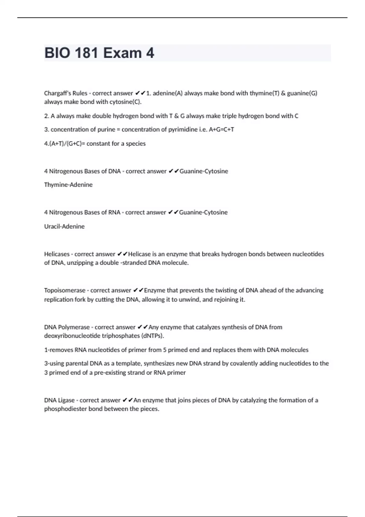 BIO 181 Exam 4Chargaff's Rules - correct answer 1. adenine(A) always make bond with thymine(T) & guanine(G) always make bond with cytosine(C). 2. A always make double hydrogen bond with T & G always make triple hydrogen bond with C 3. concentration of purine = concentration of pyrimidine i.e. A+G=C+T 4.(A+T)/(G+C)= constant for a species 4 Nitrogenous Bases of DNA - correct answer Guanine-Cytosine Thymine-Adenine 4 Nitrogenous Bases of RNA - correct answer Guanine-Cytosine Uracil-Adenine Helicases - correct answer Helicase is an enzyme that breaks hydrogen bonds between nucleotides of DNA, unzipping a double -stranded DNA molecule. Topoisomerase - correct answer Enzyme that prevents the twisting of DNA ahead of the advancing replication fork by cutting the DNA, allowing it to unwind, and rejoining it. DNA Polymerase - correct answer Any enzyme that catalyzes synthesis of DNA from deoxyribonucleotide triphosphates (dNTPs). 1-removes RNA nucleotides of primer from 5 primed end and replaces them with DNA molecules 3-using parental DNA as a template, synthesizes new DNA strand by covalently adding nucleotides to the 3 primed end of a pre-existing strand or RNA primer DNA Ligase - correct answer An enzyme that joins pieces of DNA by catalyzing the formation of a phosphodiester bond between the pieces.