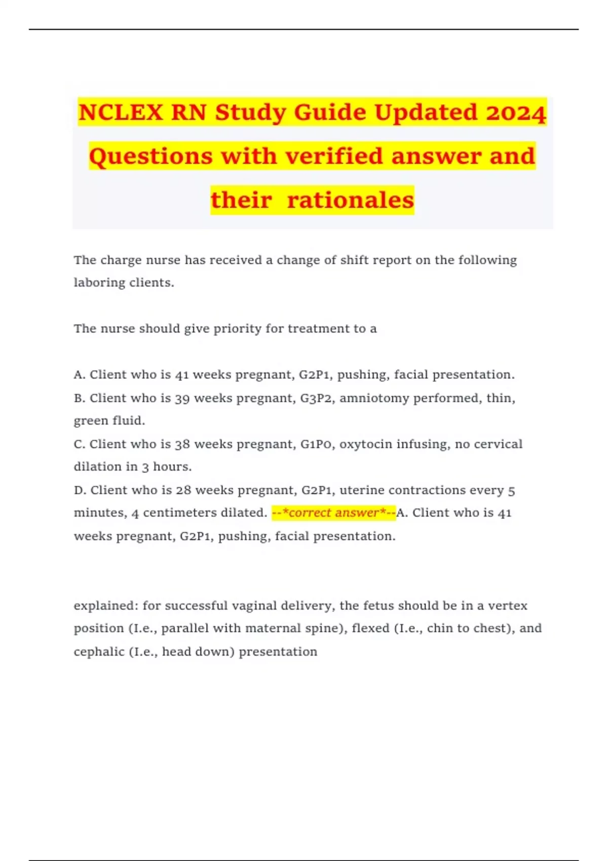 NCLEX RN Study Guide Updated 2024 Questions with verified answer and their rationales The charge nurse has received a change of shift report on the following laboring clients. The nurse should give priority for treatment to a A. Client who is 41 weeks pregnant, G2P1, pushing, facial presentation. B. Client who is 39 weeks pregnant, G3P2, amniotomy performed, thin, green fluid. C. Client who is 38 weeks pregnant, G1P0, oxytocin infusing, no cervical dilation in 3 hours. D. Client who is 28 weeks pregnant, G2P1, uterine contractions every 5 minutes, 4 centimeters dilated. --*correct answer*--A. Client who is 41 weeks pregnant, G2P1, pushing, facial presentation. explained: for successful vaginal delivery, the fetus should be in a vertex position (I.e., parallel with maternal spine), flexed (I.e., chin to chest), and cephalic (I.e., head down) presentation