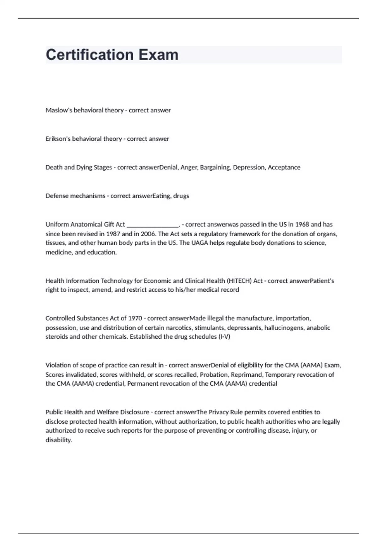 Maslow's behavioral theory - correct answer Erikson's behavioral theory - correct answer Death and Dying Stages - correct answerDenial, Anger, Bargaining, Depression, Acceptance Defense mechanisms - correct answerEating, drugs Uniform Anatomical Gift Act _______________. - correct answerwas passed in the US in 1968 and has since been revised in 1987 and in 2006. The Act sets a regulatory framework for the donation of organs, tissues, and other human body parts in the US. The UAGA helps regulate body donations to science, medicine, and education. Health Information Technology for Economic and Clinical Health (HITECH) Act - correct answerPatient's right to inspect, amend, and restrict access to his/her medical record Controlled Substances Act of 1970 - correct answerMade illegal the manufacture, importation, possession, use and distribution of certain narcotics, stimulants, depressants, hallucinogens, anabolic steroids and other chemicals. Established the drug schedules (I-V) Violation of scope of practice can result in - correct answerDenial of eligibility for the CMA (AAMA) Exam, Scores invalidated, scores withheld, or scores recalled, Probation, Reprimand, Temporary revocation of the CMA (AAMA) credential, Permanent revocation of the CMA (AAMA) credential Public Health and Welfare Disclosure - correct answerThe Privacy Rule permits covered entities to disclose protected health information, without authorization, to public health authorities who are legally authorized to receive such reports for the purpose of preventing or controlling disease, injury, or disability.