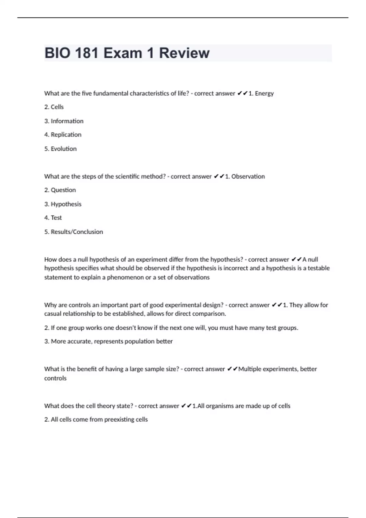 BIO 181 Exam 1 ReviewWhat are the five fundamental characteristics of life? - correct answer 1. Energy 2. Cells 3. Information 4. Replication 5. Evolution What are the steps of the scientific method? - correct answer 1. Observation 2. Question 3. Hypothesis 4. Test 5. Results/Conclusion How does a null hypothesis of an experiment differ from the hypothesis? - correct answer A null hypothesis specifies what should be observed if the hypothesis is incorrect and a hypothesis is a testable statement to explain a phenomenon or a set of observations Why are controls an important part of good experimental design? - correct answer 1. They allow for casual relationship to be established, allows for direct comparison. 2. If one group works one doesn't know if the next one will, you must have many test groups. 3. More accurate, represents population better What is the benefit of having a large sample size? - correct answer Multiple experiments, better controls What does the cell theory state? - correct answer 1.All organisms are made up of cells 2. All cells come from preexisting cells