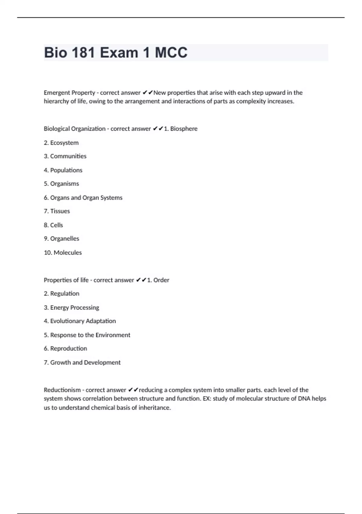 Bio 181 Exam 1 MCCEmergent Property - correct answer New properties that arise with each step upward in the hierarchy of life, owing to the arrangement and interactions of parts as complexity increases. Biological Organization - correct answer 1. Biosphere 2. Ecosystem 3. Communities 4. Populations 5. Organisms 6. Organs and Organ Systems 7. Tissues 8. Cells 9. Organelles 10. Molecules Properties of life - correct answer 1. Order 2. Regulation 3. Energy Processing 4. Evolutionary Adaptation 5. Response to the Environment 6. Reproduction 7. Growth and Development Reductionism - correct answer reducing a complex system into smaller parts. each level of the system shows correlation between structure and function. EX: study of molecular structure of DNA helps us to understand chemical basis of inheritance.