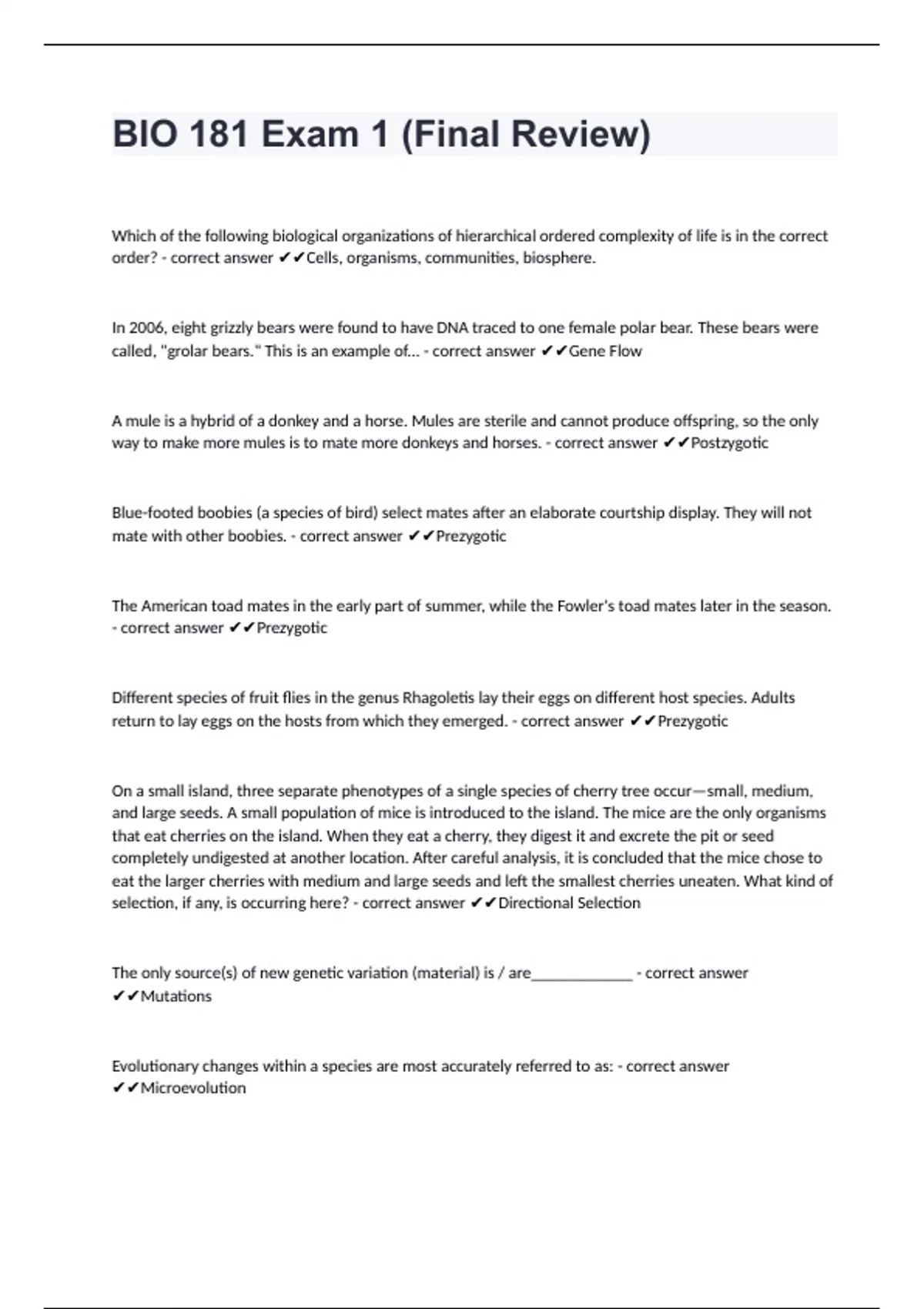 BIO 181 Exam 1 (Final Review)Which of the following biological organizations of hierarchical ordered complexity of life is in the correct order? - correct answer Cells, organisms, communities, biosphere. In 2006, eight grizzly bears were found to have DNA traced to one female polar bear. These bears were called, "grolar bears." This is an example of... - correct answer Gene Flow A mule is a hybrid of a donkey and a horse. Mules are sterile and cannot produce offspring, so the only way to make more mules is to mate more donkeys and horses. - correct answer Postzygotic Blue-footed boobies (a species of bird) select mates after an elaborate courtship display. They will not mate with other boobies. - correct answer Prezygotic The American toad mates in the early part of summer, while the Fowler's toad mates later in the season. - correct answer Prezygotic Different species of fruit flies in the genus Rhagoletis lay their eggs on different host species. Adults return to lay eggs on the hosts from which they emerged. - correct answer Prezygotic On a small island, three separate phenotypes of a single species of cherry tree occur—small, medium, and large seeds. A small population of mice is introduced to the island. The mice are the only organisms that eat cherries on the island. When they eat a cherry, they digest it and excrete the pit or seed completely undigested at another location. After careful analysis, it is concluded that the mice chose to eat the larger cherries with medium and large seeds and left the smallest cherries uneaten. What kind of selection, if any, is occurring here? - correct answer Directional Selection The only source(s) of new genetic variation (material) is / are____________ - correct answer Mutations Evolutionary changes within a species are most accurately referred to as: - correct answer Microevolution