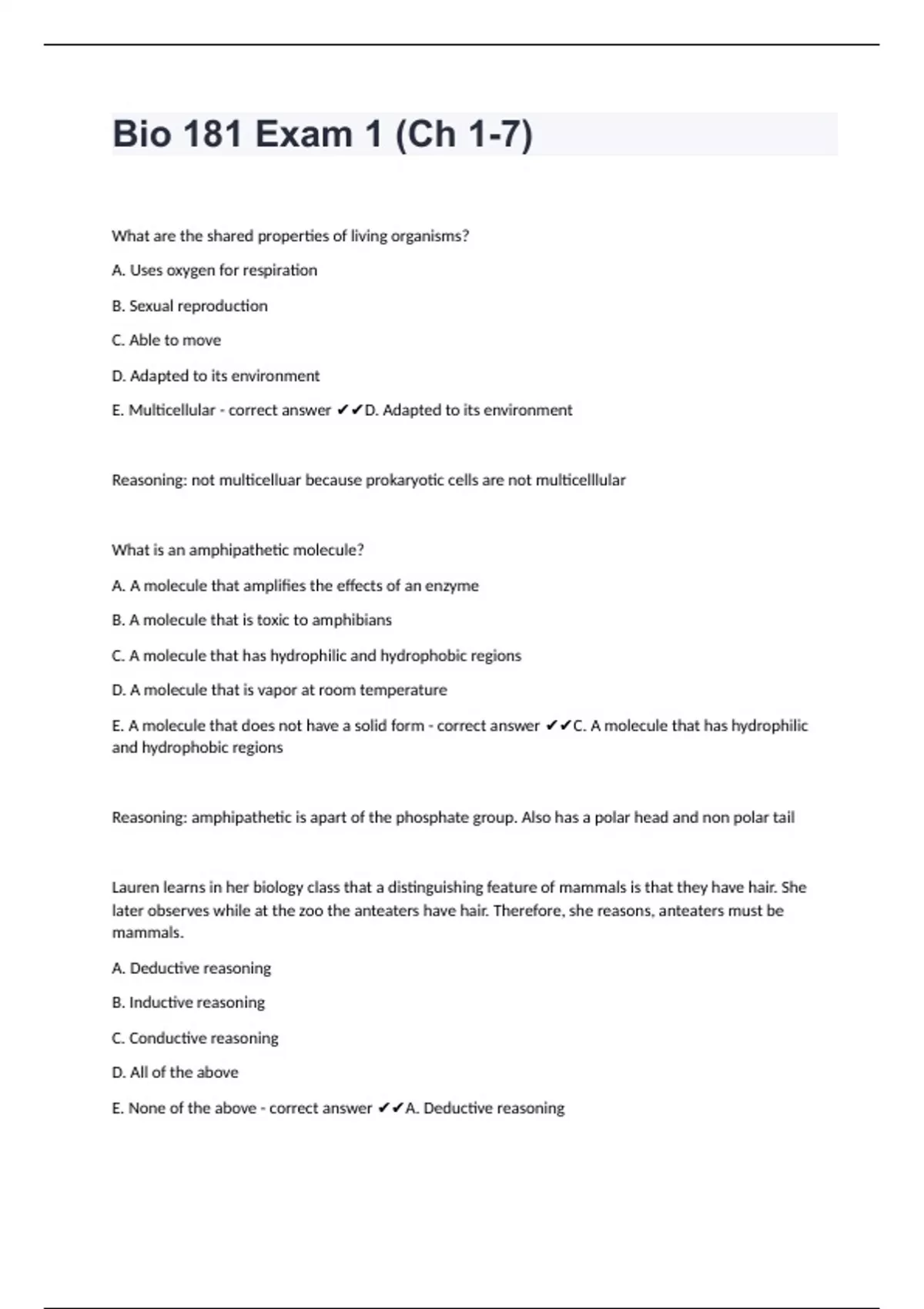 Bio 181 Exam 1 (Ch 1-7)What are the shared properties of living organisms? A. Uses oxygen for respiration B. Sexual reproduction C. Able to move D. Adapted to its environment E. Multicellular - correct answer D. Adapted to its environment Reasoning: not multicelluar because prokaryotic cells are not multicelllular What is an amphipathetic molecule? A. A molecule that amplifies the effects of an enzyme B. A molecule that is toxic to amphibians C. A molecule that has hydrophilic and hydrophobic regions D. A molecule that is vapor at room temperature E. A molecule that does not have a solid form - correct answer C. A molecule that has hydrophilic and hydrophobic regions Reasoning: amphipathetic is apart of the phosphate group. Also has a polar head and non polar tail Lauren learns in her biology class that a distinguishing feature of mammals is that they have hair. She later observes while at the zoo the anteaters have hair. Therefore, she reasons, anteaters must be mammals. A. Deductive reasoning B. Inductive reasoning C. Conductive reasoning D. All of the above